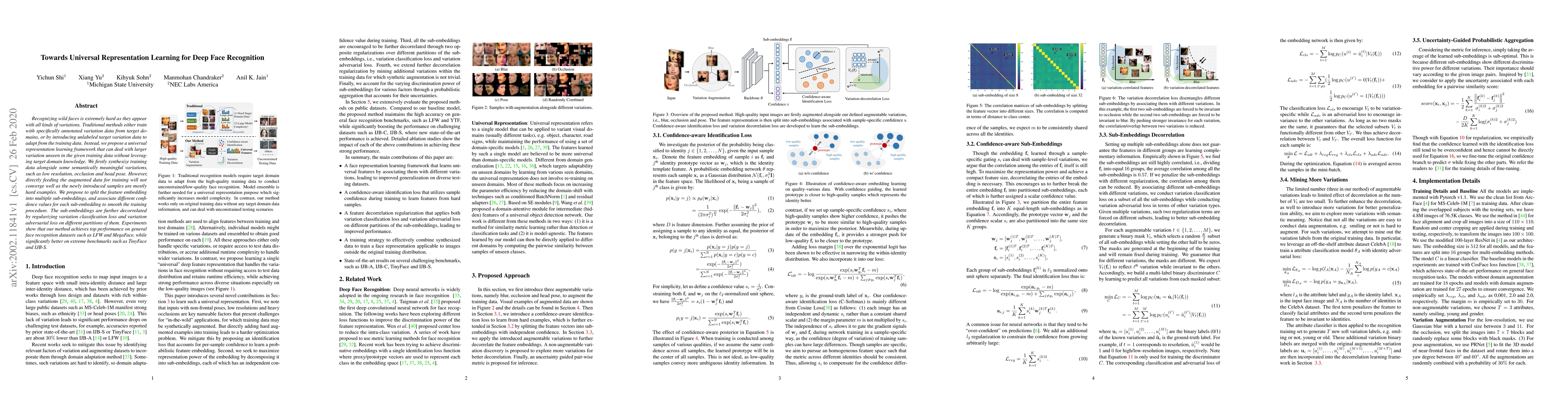 Recognizing wild faces is extremely hard as they appear with all kinds of variations. Traditional methods either train with specifically annotated variation data from target domains, or by introducing unlabeled target variation data to adapt from the training data. Instead, we propose a universal representation learning framework that can deal with larger variation unseen in the given training data without leveraging target domain knowledge. We firstly synthesize training data alongside some semantically meaningful variations, such as low resolution, occlusion and head pose. However, directly feeding the augmented data for training will not converge well as the newly introduced samples are mostly hard examples. We propose to split the feature embedding into multiple sub-embeddings, and associate different confidence values for each sub-embedding to smooth the training procedure. The sub-embeddings are further decorrelated by regularizing variation classification loss and variation adversarial loss on different partitions of them. Experiments show that our method achieves top performance on general face recognition datasets such as LFW and MegaFace, while significantly better on extreme benchmarks such as TinyFace and IJB-S.