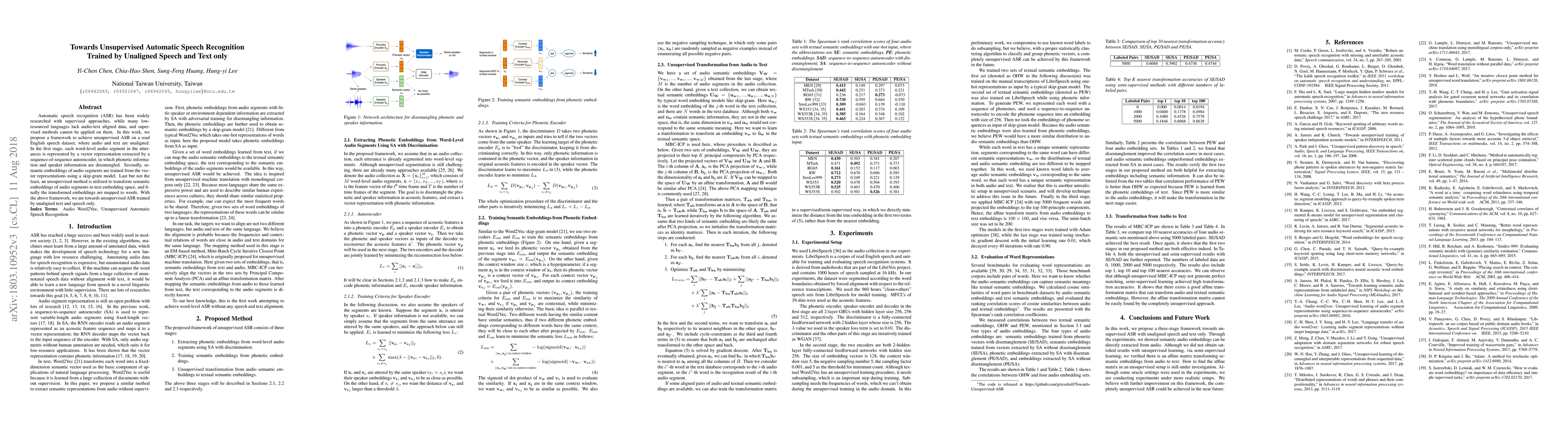This paper proposes a framework for unsupervised automatic speech recognition (ASR) using only unaligned speech and text data. The method involves extracting vector representations from unaligned audio segments, training semantic embeddings, and transforming these embeddings to map audio to text without requiring aligned audio-text pairs.