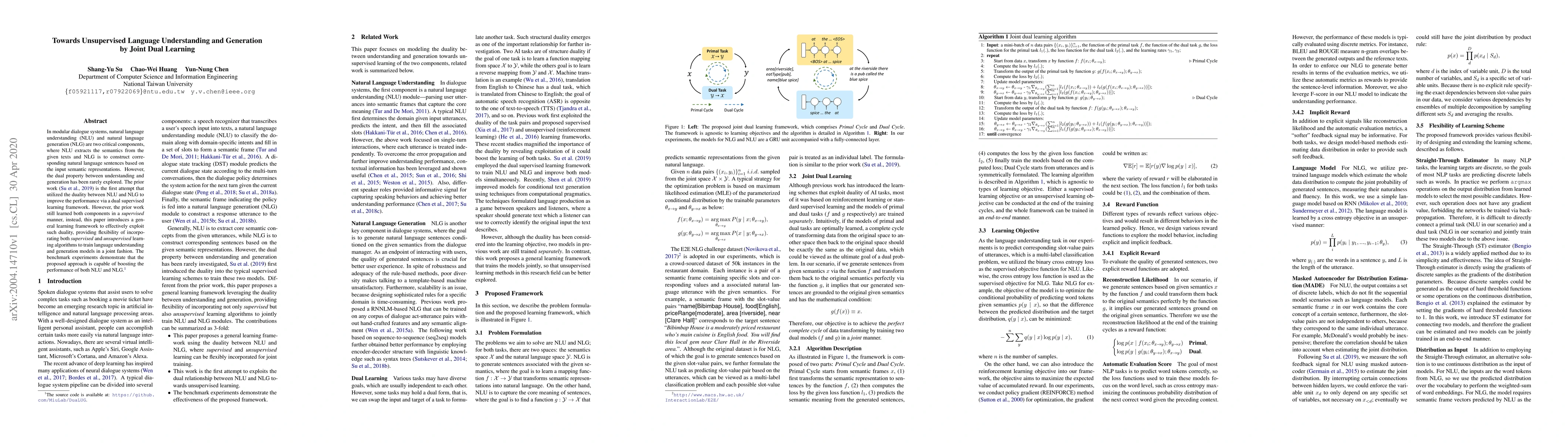 This paper proposes a joint dual learning framework for unsupervised natural language understanding (NLU) and natural language generation (NLG), leveraging the duality between NLU and NLG to enhance performance through both supervised and unsupervised methods, achieving better results than prior supervised approaches.