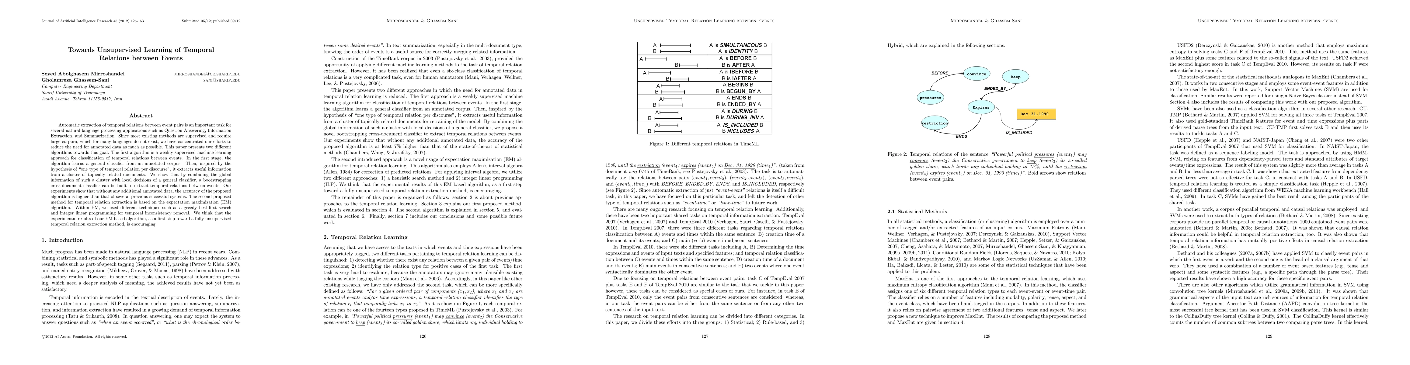 The paper presents two unsupervised algorithms for learning temporal relations between events. The first is a weakly supervised machine learning approach using a general classifier and bootstrapping, while the second employs the expectation-maximization (EM) algorithm with techniques like greedy best-first search and integer linear programming for inconsistency removal.