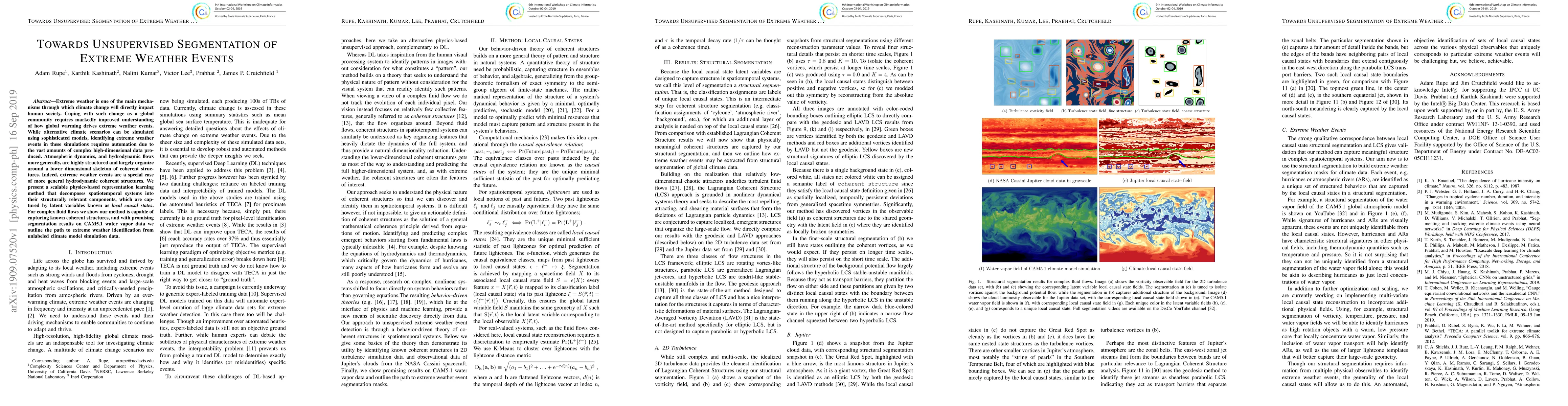 Extreme weather is one of the main mechanisms through which climate change will directly impact human society. Coping with such change as a global community requires markedly improved understanding of how global warming drives extreme weather events. While alternative climate scenarios can be simulated using sophisticated models, identifying extreme weather events in these simulations requires automation due to the vast amounts of complex high-dimensional data produced. Atmospheric dynamics, and hydrodynamic flows more generally, are highly structured and largely organize around a lower dimensional skeleton of coherent structures. Indeed, extreme weather events are a special case of more general hydrodynamic coherent structures. We present a scalable physics-based representation learning method that decomposes spatiotemporal systems into their structurally relevant components, which are captured by latent variables known as local causal states. For complex fluid flows we show our method is capable of capturing known coherent structures, and with promising segmentation results on CAM5.1 water vapor data we outline the path to extreme weather identification from unlabeled climate model simulation data.