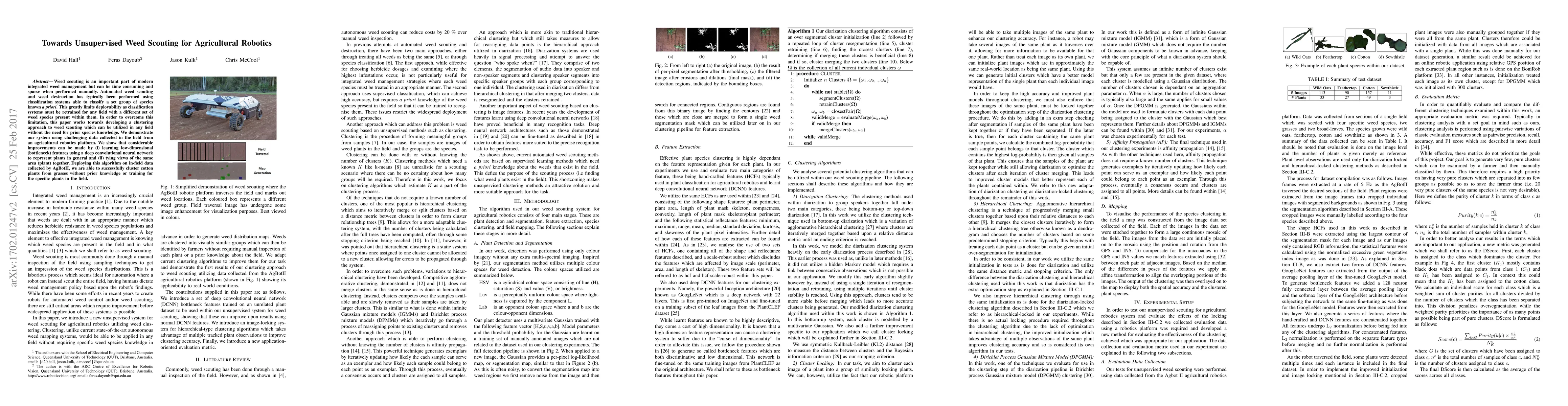 This paper proposes an unsupervised clustering approach for weed scouting in agricultural robotics, utilizing deep convolutional neural networks to identify and differentiate plant species without prior knowledge. The method successfully clusters cotton plants from grasses using in-field data from AgBotII, demonstrating potential for adaptable, field-specific weed management.