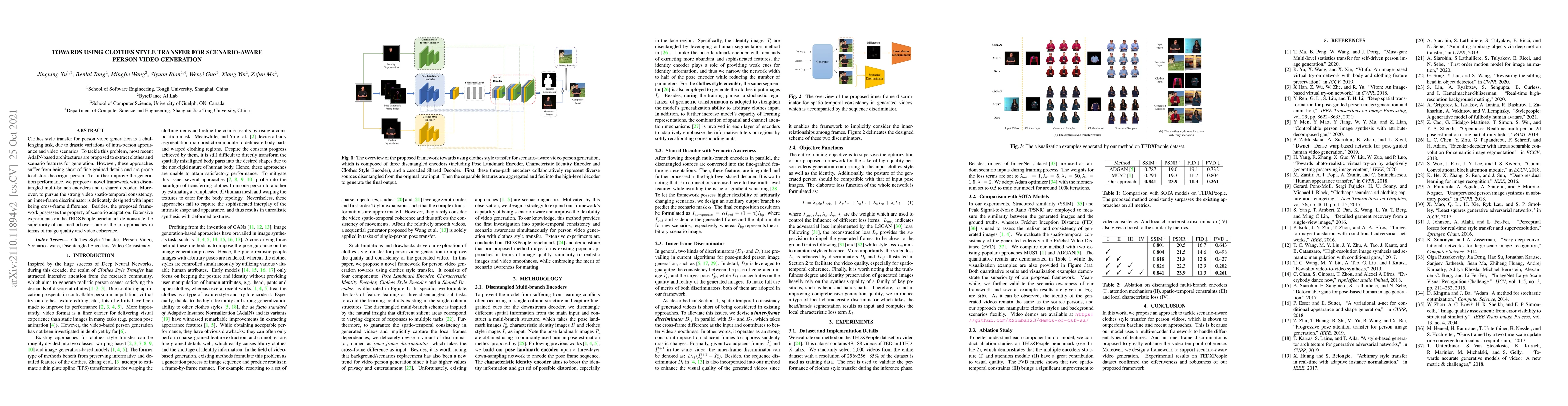 This paper proposes a novel framework for clothes style transfer in person video generation, utilizing disentangled multi-branch encoders and a shared decoder to improve detail and scenario adaptation. An inner-frame discriminator ensures spatio-temporal consistency, outperforming state-of-the-art methods on the TEDXPeople benchmark.