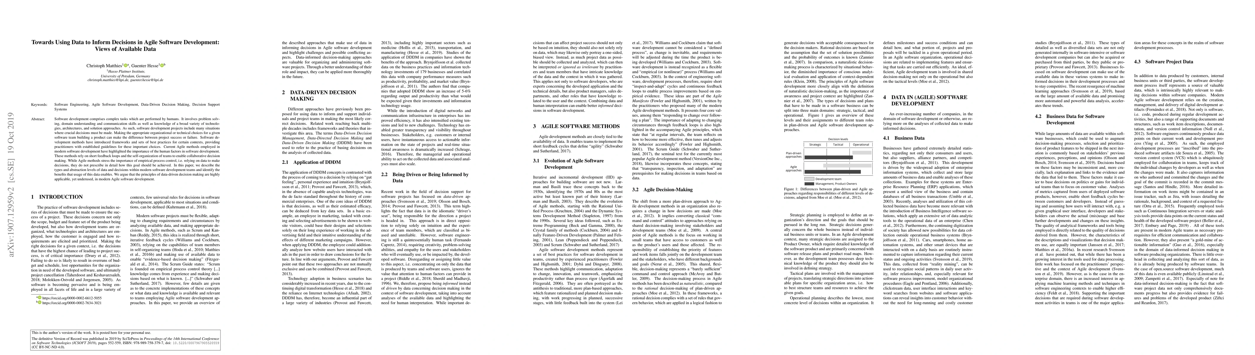 Software development comprises complex tasks which are performed by humans. It involves problem solving, domain understanding and communication skills as well as knowledge of a broad variety of technologies, architectures, and solution approaches. As such, software development projects include many situations where crucial decisions must be made. Making the appropriate organizational or technical choices for a given software team building a product can make the difference between project success or failure. Software development methods have introduced frameworks and sets of best practices for certain contexts, providing practitioners with established guidelines for these important choices. Current Agile methods employed in modern software development have highlighted the importance of the human factors in software development. These methods rely on short feedback loops and the self-organization of teams to enable collaborative decision making. While Agile methods stress the importance of empirical process control, i.e. relying on data to make decisions, they do not prescribe in detail how this goal should be achieved. In this paper, we describe the types and abstraction levels of data and decisions within modern software development teams and identify the benefits that usage of this data enables. We argue that the principles of data-driven decision making are highly applicable, yet underused, in modern Agile software development.