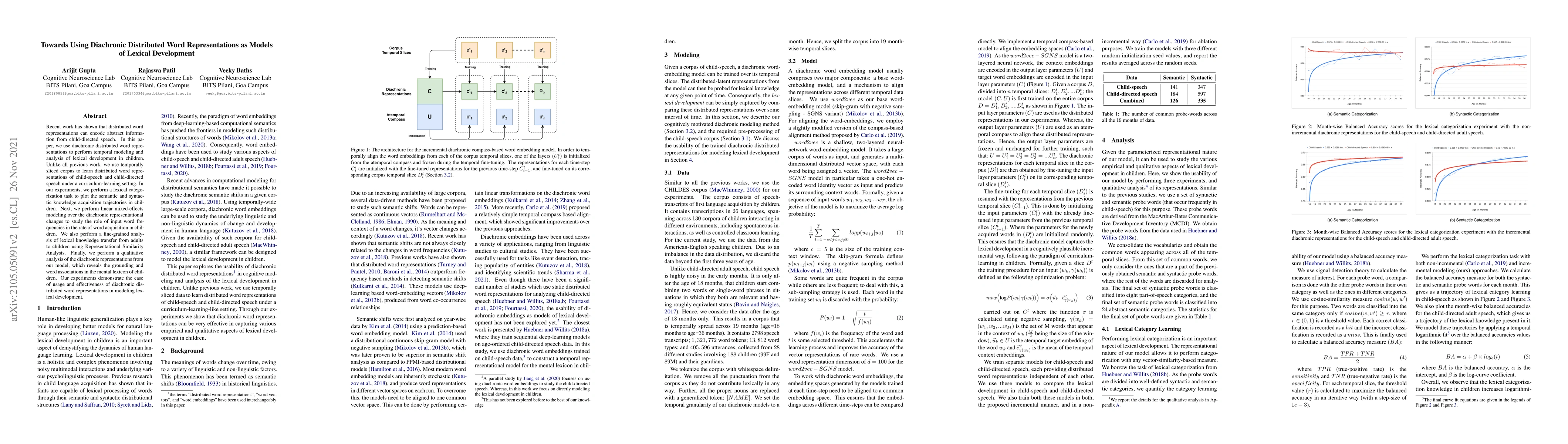 This paper explores the use of diachronic distributed word representations to model and analyze lexical development in children, employing temporally sliced corpora and curriculum learning. It demonstrates the effectiveness of these models in tracking semantic and syntactic knowledge acquisition and reveals insights into word frequency's role in word acquisition and lexical knowledge transfer from adults to children.