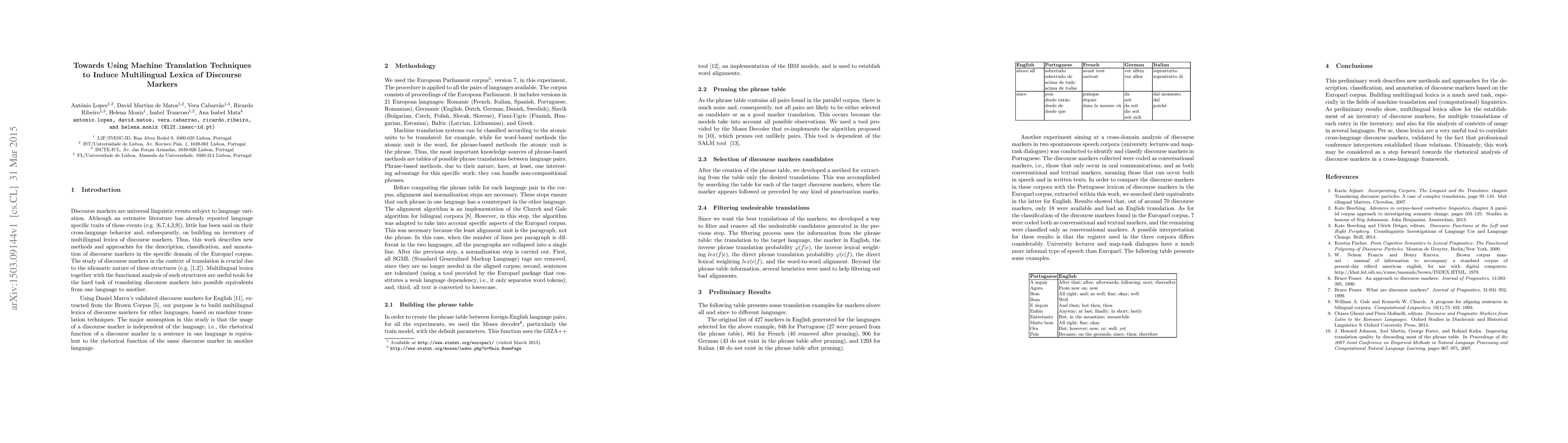 The use of machine translation techniques to induce multilingual lexica of discourse markers is novel and different from existing research