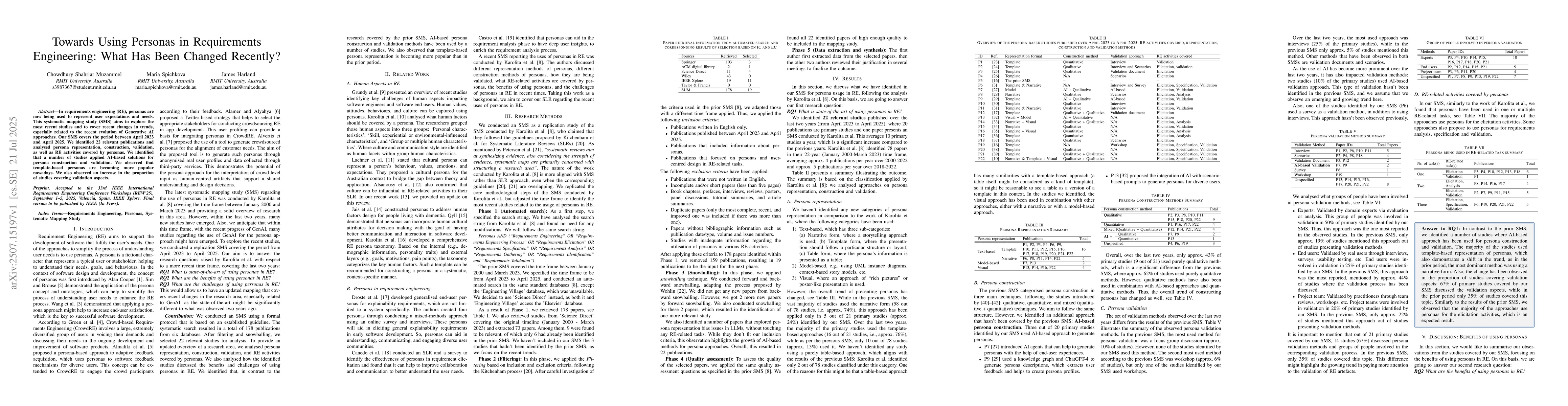In requirements engineering (RE), personas are now being used to represent user expectations and needs. This systematic mapping study (SMS) aims to explore the most recent studies and to cover recent changes in trends, especially related to the recent evolution of Generative AI approaches. Our SMS covers the period between April 2023 and April 2025. We identified 22 relevant publications and analysed persona representation, construction, validation, as well as RE activities covered by personas. We identified that a number of studies applied AI-based solutions for persona construction and validation. We observed that template-based personas are becoming more popular nowadays. We also observed an increase in the proportion of studies covering validation aspects.