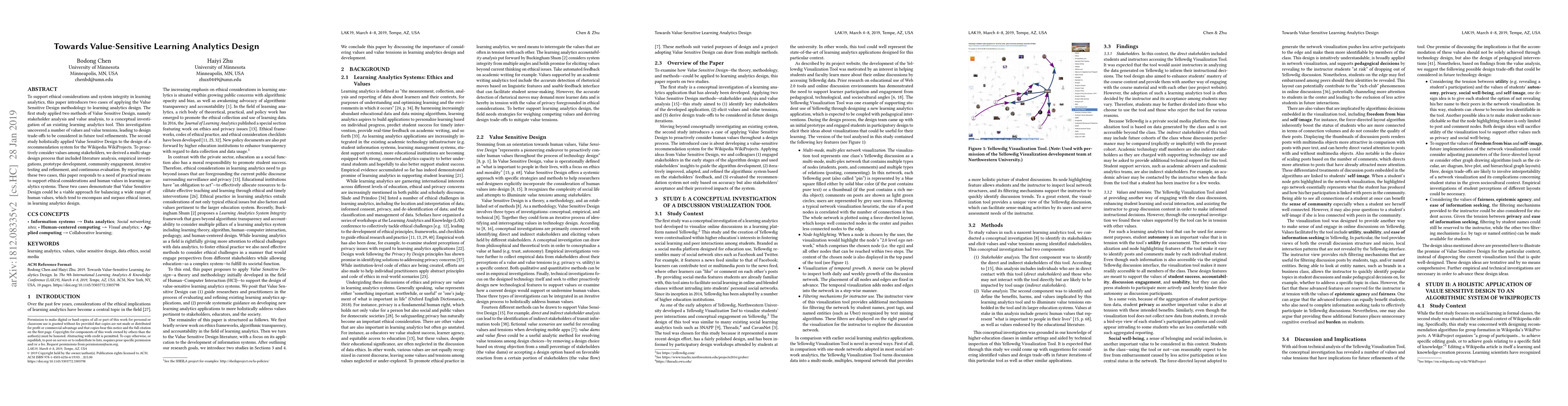 This paper explores the application of Value Sensitive Design methodology to learning analytics, detailing two case studies that highlight ethical considerations and system integrity. The first case analyzes an existing tool, revealing value tensions and design trade-offs, while the second designs a recommendation system for Wikipedia WikiProjects through a comprehensive multi-stage process, demonstrating the methodology's potential for balancing diverse human values in learning analytics.