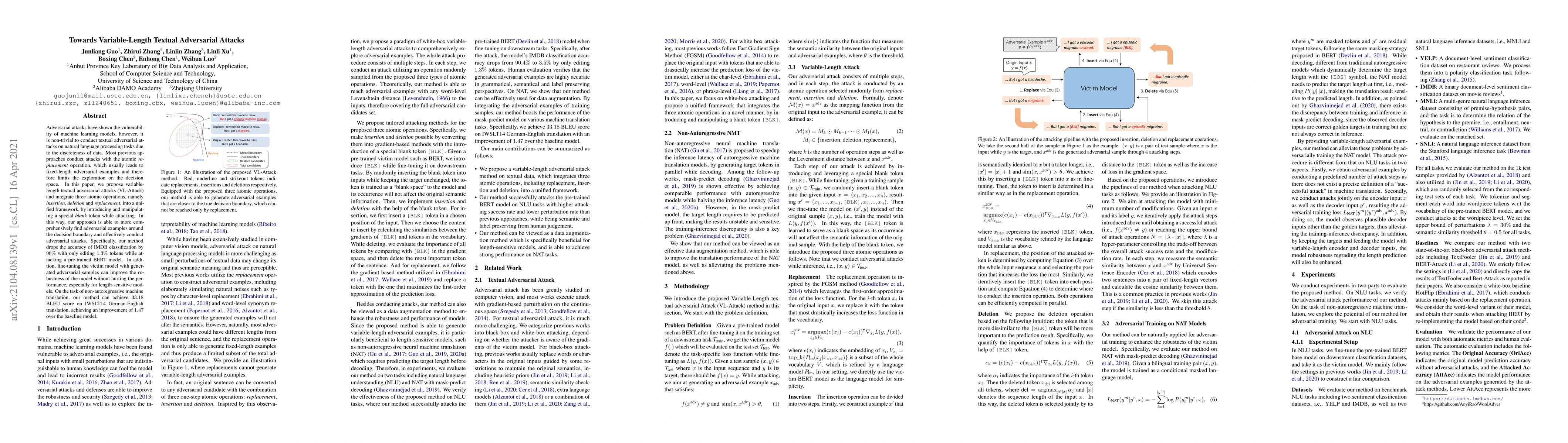 This paper proposes a variable-length textual adversarial attack method (VL-Attack) that integrates insertion, deletion, and replacement operations using a blank token to generate more effective adversarial examples. The method significantly reduces the accuracy of a pre-trained BERT model on IMDB classification and improves the robustness of machine translation models.