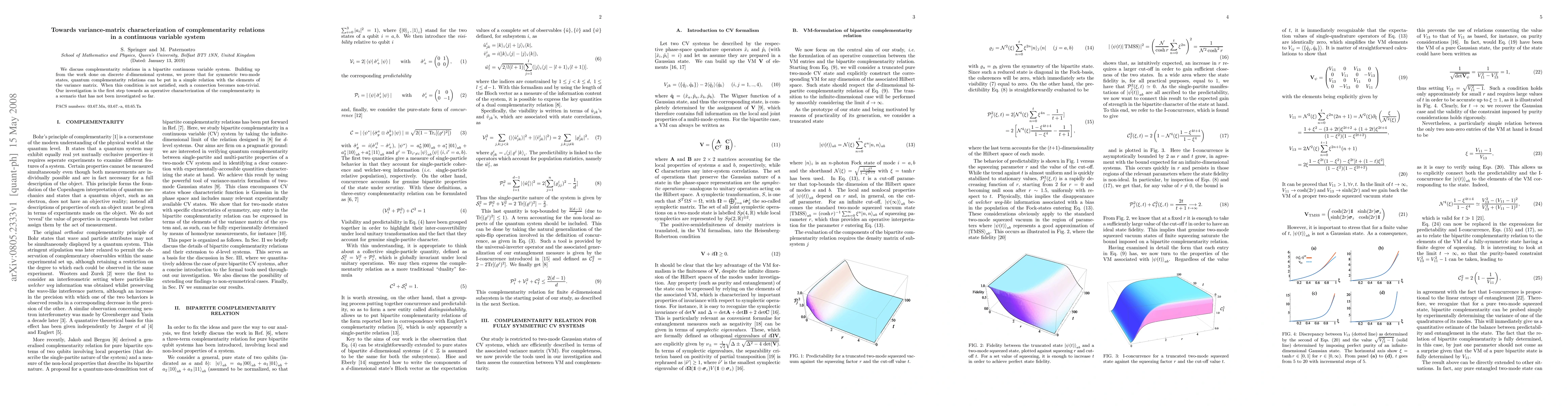 This paper explores complementarity relations in a bipartite continuous variable system, demonstrating that for symmetric two-mode states, quantum complementarity can be linked to the variance matrix elements. It marks the first step towards characterizing complementarity in this previously unexplored scenario.