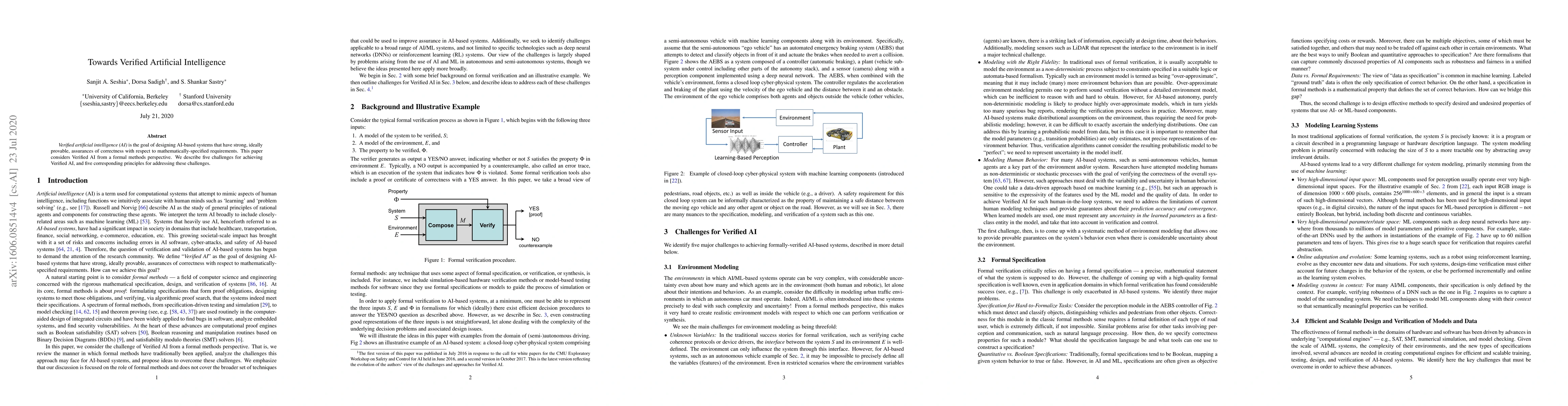 Verified artificial intelligence (AI) is the goal of designing AI-based systems that that have strong, ideally provable, assurances of correctness with respect to mathematically-specified requirements. This paper considers Verified AI from a formal methods perspective. We describe five challenges for achieving Verified AI, and five corresponding principles for addressing these challenges.