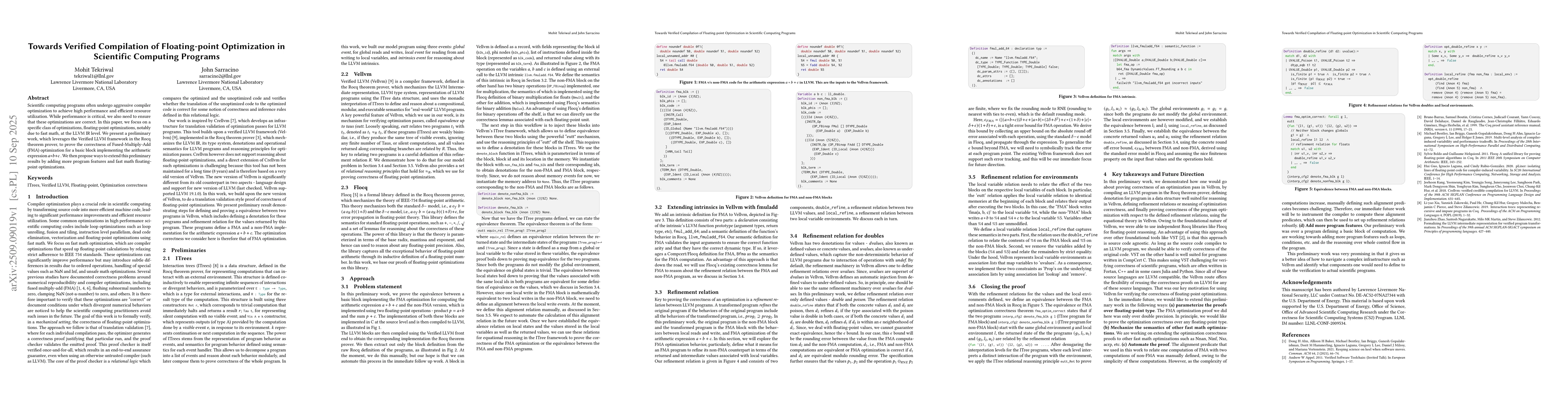 Scientific computing programs often undergo aggressive compiler optimization to achieve high performance and efficient resource utilization. While performance is critical, we also need to ensure that these optimizations are correct. In this paper, we focus on a specific class of optimizations, floating-point optimizations, notably due to fast math, at the LLVM IR level. We present a preliminary work, which leverages the Verified LLVM framework in the Rocq theorem prover, to prove the correctness of Fused-Multiply-Add (FMA) optimization for a basic block implementing the arithmetic expression $a * b + c$ . We then propose ways to extend this preliminary results by adding more program features and fast math floating-point optimizations.