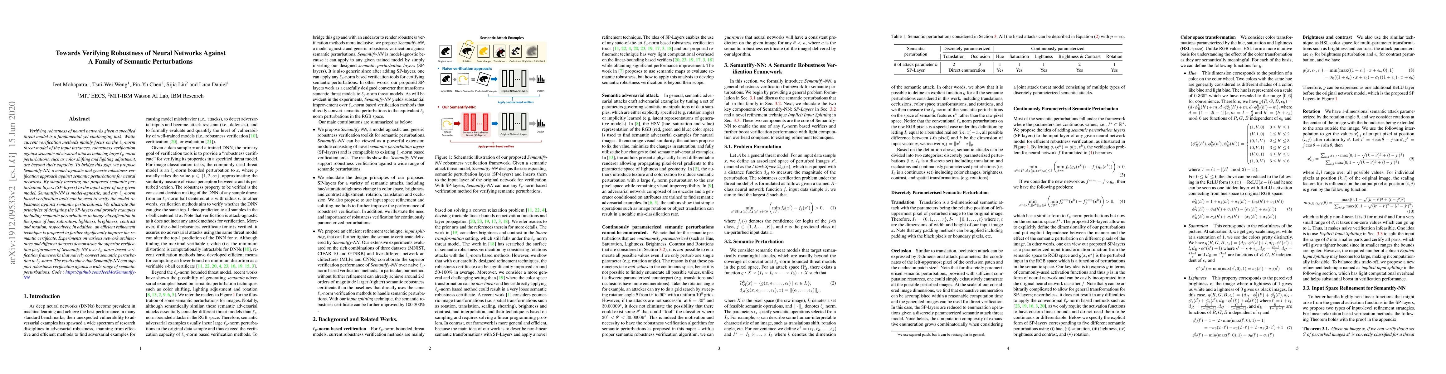 This paper proposes Semantify-NN, a model-agnostic approach for verifying neural network robustness against semantic perturbations like color shifting and lighting adjustments. By adding semantic perturbation layers to any given model, it enhances verification performance compared to traditional $\ell_p$-norm methods.