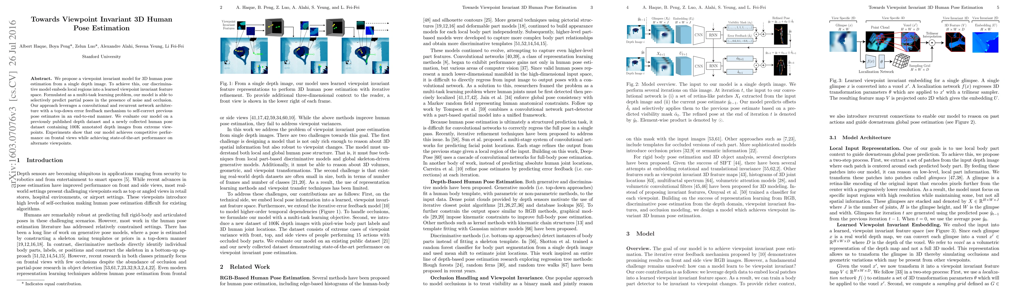 This paper proposes a viewpoint invariant model for 3D human pose estimation using a single depth image, employing a discriminative approach that embeds local regions into a learned feature space. The model, formulated as a multi-task learning problem, utilizes a convolutional and recurrent network architecture with self-correction mechanisms, achieving competitive results on frontal views and state-of-the-art performance on alternate viewpoints.