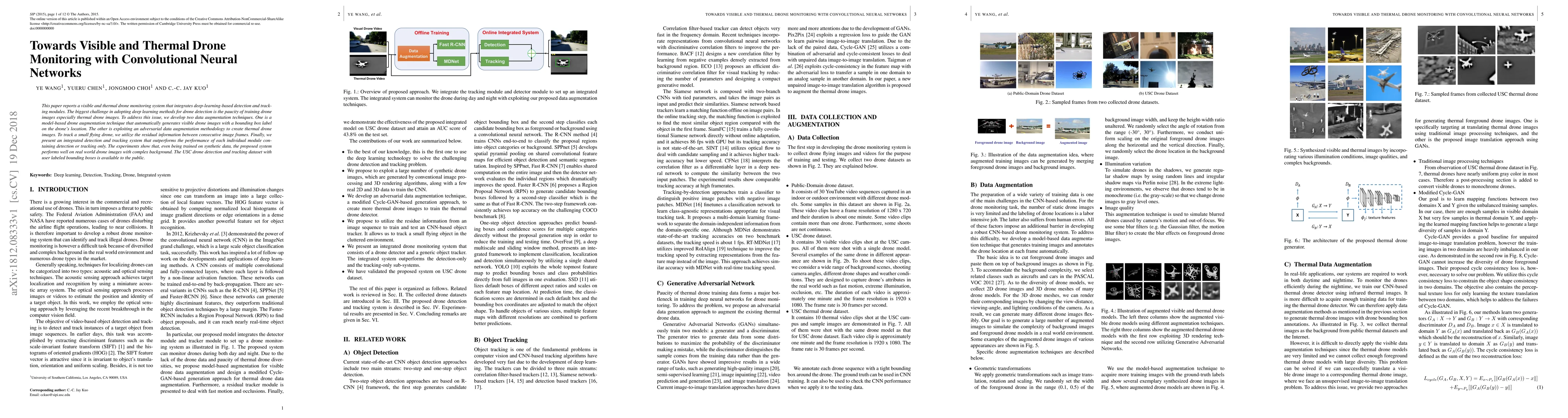 This paper presents a drone monitoring system using convolutional neural networks for both visible and thermal imaging, addressing the scarcity of training data through innovative data augmentation techniques. The system integrates detection and tracking modules, achieving superior performance compared to standalone modules, and demonstrates effectiveness on real-world images.