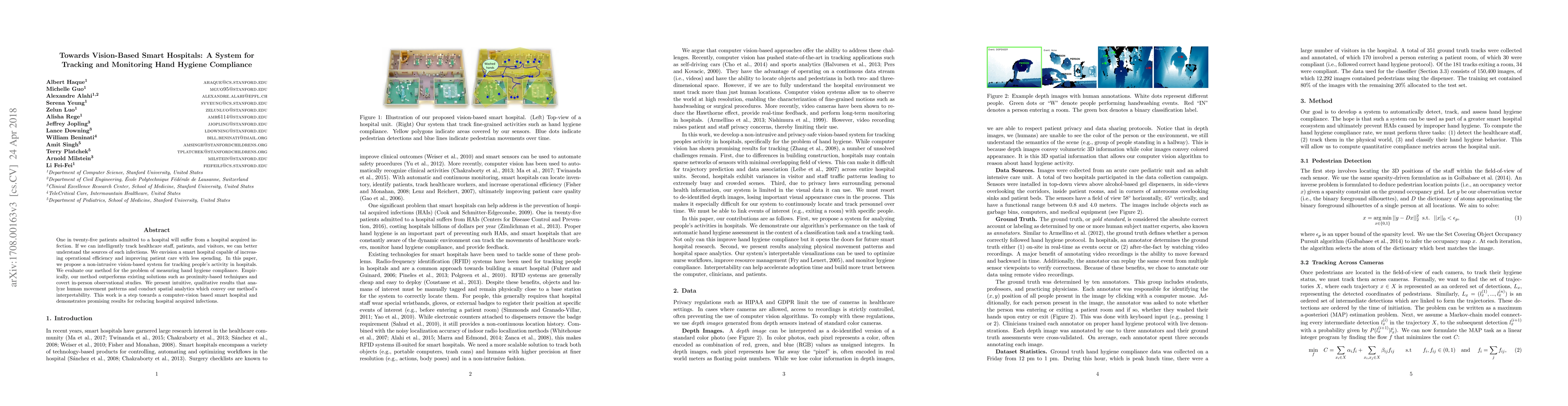 One in twenty-five patients admitted to a hospital will suffer from a hospital acquired infection. If we can intelligently track healthcare staff, patients, and visitors, we can better understand the sources of such infections. We envision a smart hospital capable of increasing operational efficiency and improving patient care with less spending. In this paper, we propose a non-intrusive vision-based system for tracking people's activity in hospitals. We evaluate our method for the problem of measuring hand hygiene compliance. Empirically, our method outperforms existing solutions such as proximity-based techniques and covert in-person observational studies. We present intuitive, qualitative results that analyze human movement patterns and conduct spatial analytics which convey our method's interpretability. This work is a step towards a computer-vision based smart hospital and demonstrates promising results for reducing hospital acquired infections.