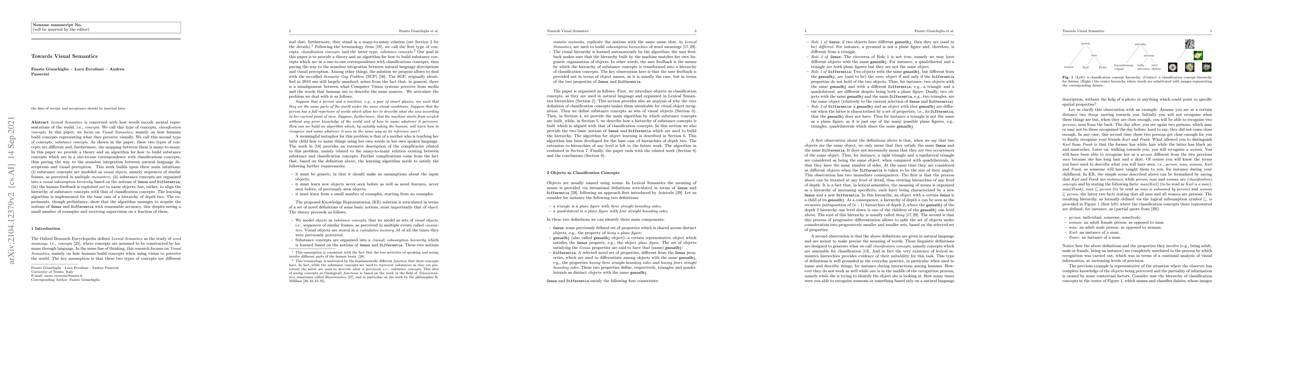 Lexical Semantics is concerned with how words encode mental representations of the world, i.e., concepts . We call this type of concepts, classification concepts . In this paper, we focus on Visual Semantics , namely on how humans build concepts representing what they perceive visually. We call this second type of concepts, substance concepts . As shown in the paper, these two types of concepts are different and, furthermore, the mapping between them is many-to-many. In this paper we provide a theory and an algorithm for how to build substance concepts which are in a one-to-one correspondence with classifications concepts, thus paving the way to the seamless integration between natural language descriptions and visual perception. This work builds upon three main intuitions: (i) substance concepts are modeled as visual objects , namely sequences of similar frames, as perceived in multiple encounters ; (ii) substance concepts are organized into a visual subsumption hierarchy based on the notions of Genus and Differentia ; (iii) the human feedback is exploited not to name objects, but, rather, to align the hierarchy of substance concepts with that of classification concepts. The learning algorithm is implemented for the base case of a hierarchy of depth two. The experiments, though preliminary, show that the algorithm manages to acquire the notions of Genus and Differentia with reasonable accuracy, this despite seeing a small number of examples and receiving supervision on a fraction of them.