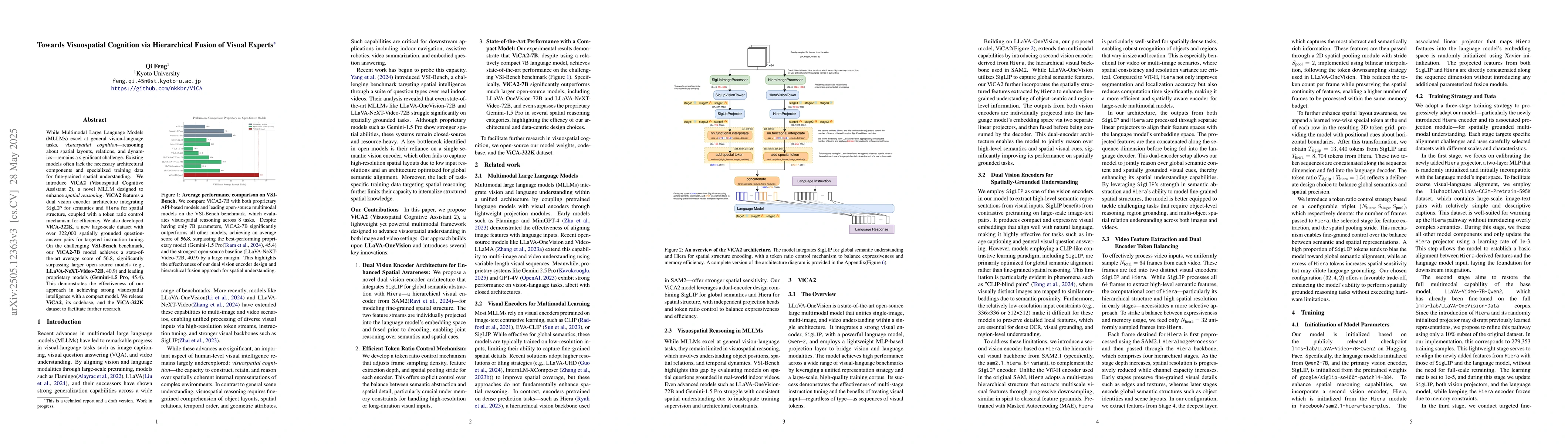 ViCA2's novelty lies in its hierarchical fusion of visual experts (SigLIP for semantics and Hiera for spatial structure) within a single MLLM framework, combined with a token ratio control mechanism for balancing efficiency and performance. The ViCA-322K dataset also offers a substantial, targeted resource for instruction tuning in visuospatial AI.