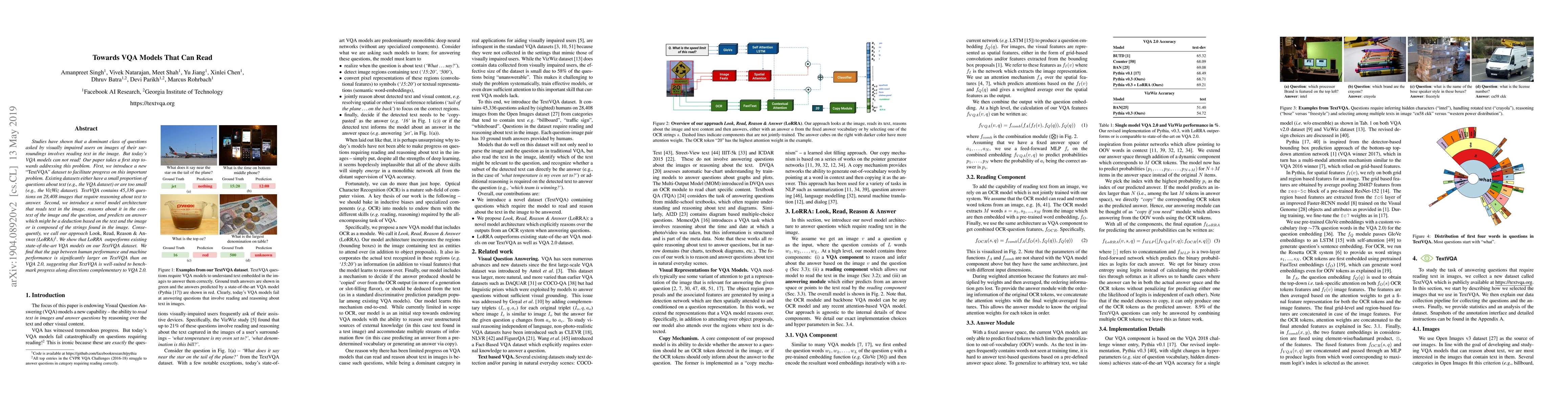 Studies have shown that a dominant class of questions asked by visually impaired users on images of their surroundings involves reading text in the image. But today's VQA models can not read! Our paper takes a first step towards addressing this problem. First, we introduce a new "TextVQA" dataset to facilitate progress on this important problem. Existing datasets either have a small proportion of questions about text (e.g., the VQA dataset) or are too small (e.g., the VizWiz dataset). TextVQA contains 45,336 questions on 28,408 images that require reasoning about text to answer. Second, we introduce a novel model architecture that reads text in the image, reasons about it in the context of the image and the question, and predicts an answer which might be a deduction based on the text and the image or composed of the strings found in the image. Consequently, we call our approach Look, Read, Reason & Answer (LoRRA). We show that LoRRA outperforms existing state-of-the-art VQA models on our TextVQA dataset. We find that the gap between human performance and machine performance is significantly larger on TextVQA than on VQA 2.0, suggesting that TextVQA is well-suited to benchmark progress along directions complementary to VQA 2.0.