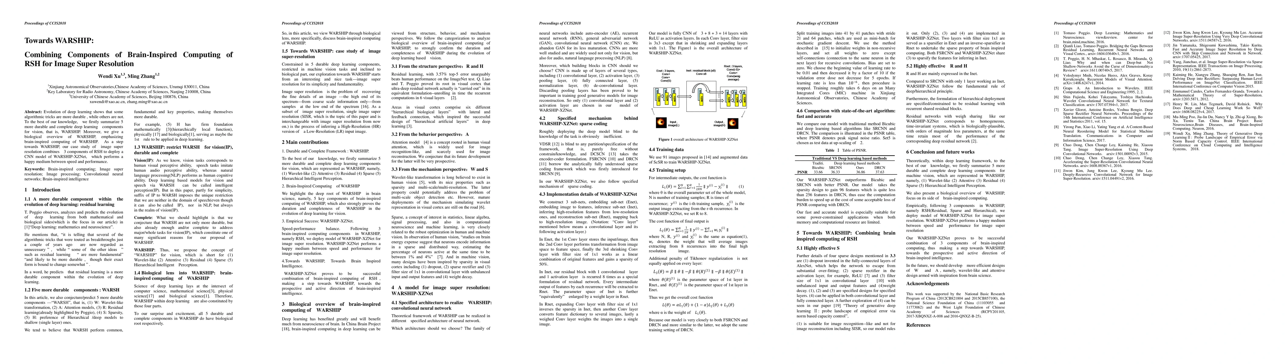 Evolution of deep learning shows that some algorithmic tricks are more durable , while others are not. To the best of our knowledge, we firstly summarize 5 more durable and complete deep learning components for vision, that is, WARSHIP. Moreover, we give a biological overview of WARSHIP, emphasizing brain-inspired computing of WARSHIP. As a step towards WARSHIP, our case study of image super resolution combines 3 components of RSH to deploy a CNN model of WARSHIP-XZNet, which performs a happy medium between speed and performance.