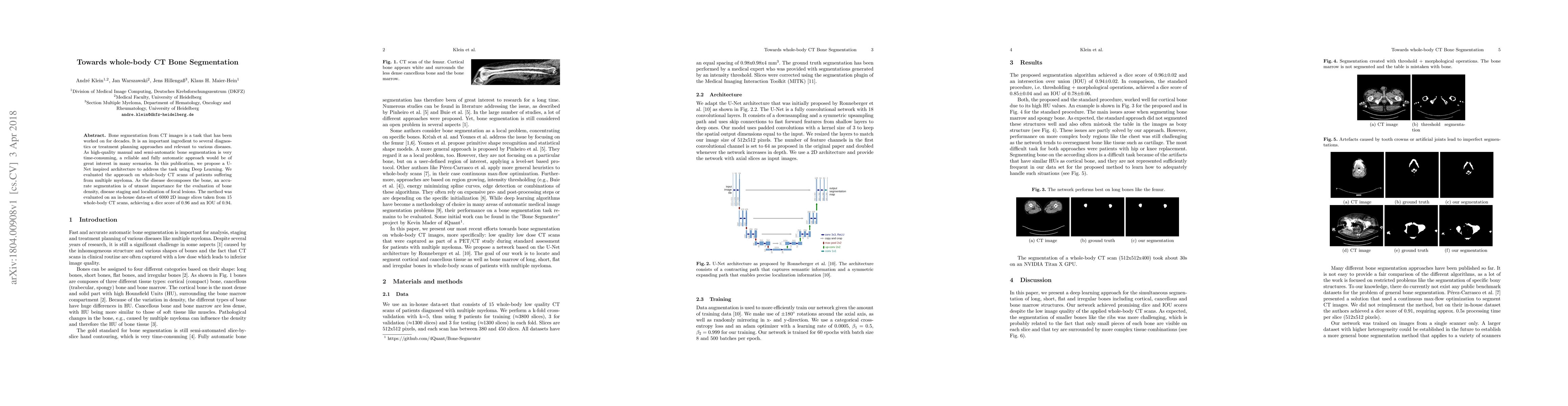This paper proposes a UNet-inspired deep learning architecture for fully automatic bone segmentation from whole-body CT scans, evaluated on patients with multiple myeloma. The method achieved high accuracy with a dice score of 0.96 and an IOU of 0.94 on an in-house dataset of 6000 2D slices.