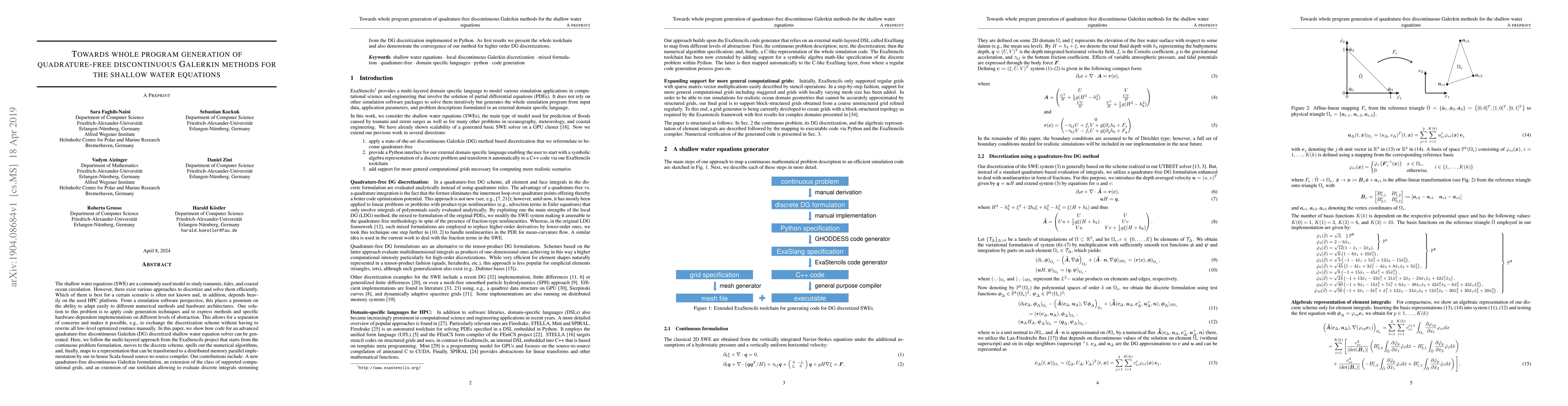 The shallow water equations (SWE) are a commonly used model to study tsunamis, tides, and coastal ocean circulation. However, there exist various approaches to discretize and solve them efficiently. Which of them is best for a certain scenario is often not known and, in addition, depends heavily on the used HPC platform. From a simulation software perspective, this places a premium on the ability to adapt easily to different numerical methods and hardware architectures. One solution to this problem is to apply code generation techniques and to express methods and specific hardware-dependent implementations on different levels of abstraction. This allows for a separation of concerns and makes it possible, e.g., to exchange the discretization scheme without having to rewrite all low-level optimized routines manually. In this paper, we show how code for an advanced quadrature-free discontinuous Galerkin (DG) discretized shallow water equation solver can be generated. Here, we follow the multi-layered approach from the ExaStencils project that starts from the continuous problem formulation, moves to the discrete scheme, spells out the numerical algorithms, and, finally, maps to a representation that can be transformed to a distributed memory parallel implementation by our in-house Scala-based source-to-source compiler. Our contributions include: A new quadrature-free discontinuous Galerkin formulation, an extension of the class of supported computational grids, and an extension of our toolchain allowing to evaluate discrete integrals stemming from the DG discretization implemented in Python. As first results we present the whole toolchain and also demonstrate the convergence of our method for higher order DG discretizations.