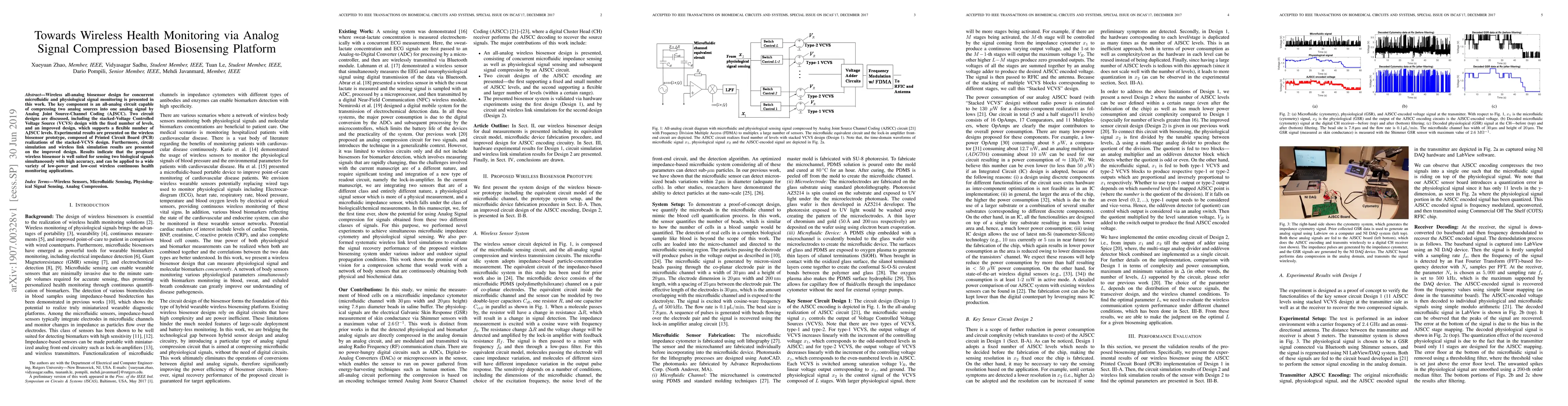 Wireless all-analog biosensor design for concurrent microfluidic and physiological signal monitoring is presented in this work. The key component is an all-analog circuit capable of compressing two analog sources into one analog signal by Analog Joint Source-Channel Coding (AJSCC). Two circuit designs are discussed, including the stacked-Voltage Controlled Voltage Source (VCVS) design with the fixed number of levels, and an improved design, which supports a flexible number of AJSCC levels. Experimental results are presented on the wireless biosensor prototype, composed of Printed Circuit Board (PCB) realizations of the stacked-VCVS design. Furthermore, circuit simulation and wireless link simulation results are presented on the improved design. Results indicate that the proposed wireless biosensor is well suited for sensing two biological signals simultaneously with high accuracy, and can be applied to a wide variety of low-power and low-cost wireless continuous health monitoring applications.