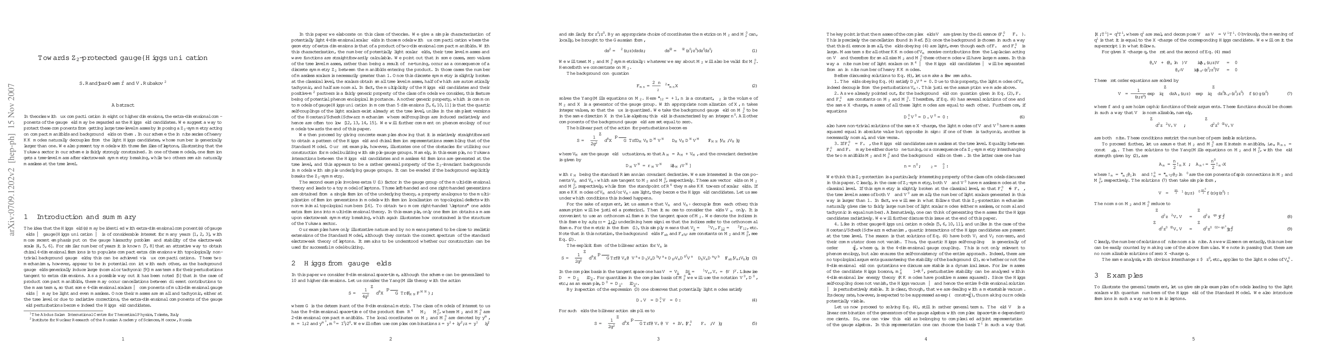 In theories with flux compactification in eight or higher dimensions, the extra-dimensional components of the gauge field may be regarded as the Higgs field candidates. We suggest a way to protect these components from getting large tree-level masses by imposing a $Z_2$-symmetry acting on compact manifolds and background fields on them. In our scheme the infinite series of heavy KK modes naturally decouples from the light Higgs candidates, whose number is generically larger than one. We also present toy models with three families of leptons, illustrating that the Yukawa sector in our scheme is fairly strongly constrained. In one of these models, one fermion gets a tree-level mass after electroweak symmetry breaking, while two others remain naturally massless at the tree level.