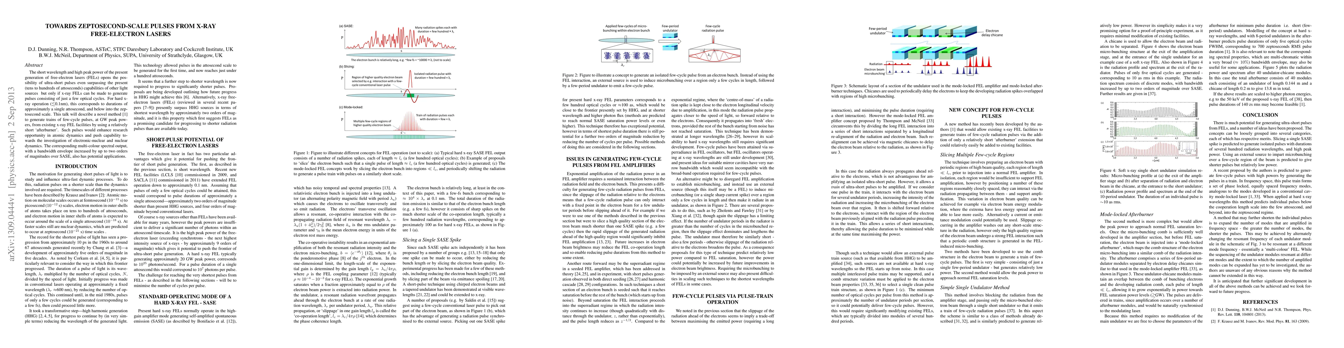 The short wavelength and high peak power of the present generation of free-electron lasers (FELs) opens the possibility of ultra-short pulses even surpassing the present (tens to hundreds of attoseconds) capabilities of other light sources - but only if x-ray FELs can be made to generate pulses consisting of just a few optical cycles. For hard x-ray operation (~0.1nm), this corresponds to durations of approximately a single attosecond, and below into the zeptosecond scale. This talk will describe a novel method to generate trains of few-cycle pulses, at GW peak powers, from existing x-ray FEL facilities by using a relatively short 'afterburner'. Such pulses would enhance research opportunity in atomic dynamics and push capability towards the investigation of electronic-nuclear and nuclear dynamics. The corresponding multi-colour spectral output, with a bandwidth envelope increased by up to two orders of magnitudes over SASE, also has potential applications.