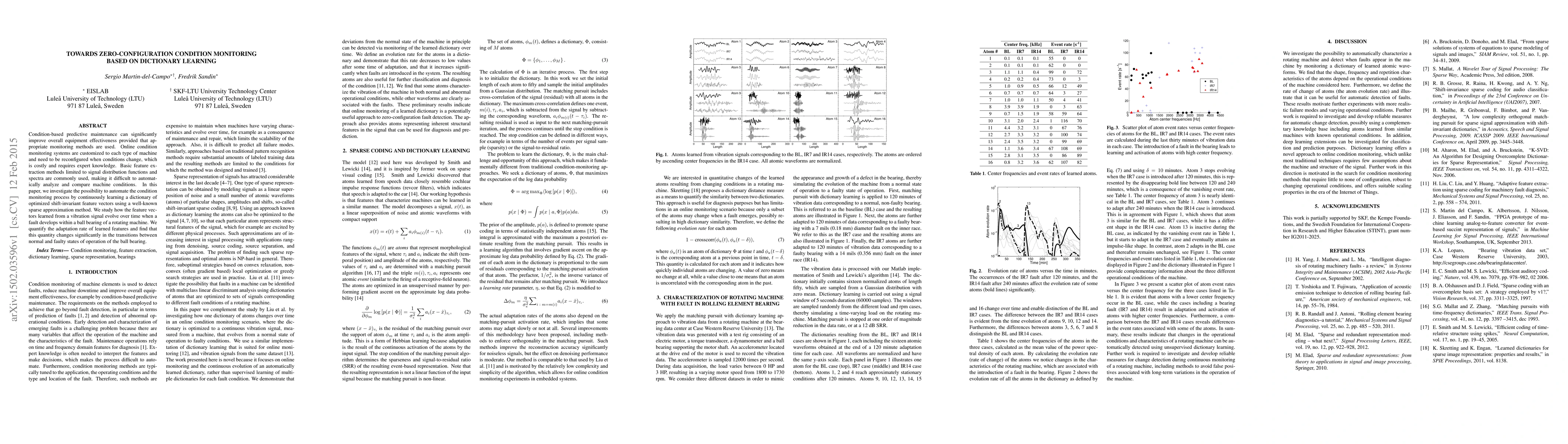This paper explores automating condition monitoring through dictionary learning for shift-invariant feature vectors, aiming to eliminate the need for reconfiguration in predictive maintenance systems. The study finds that learned features adapt significantly during transitions between normal and faulty states, indicating potential for zero-configuration monitoring.