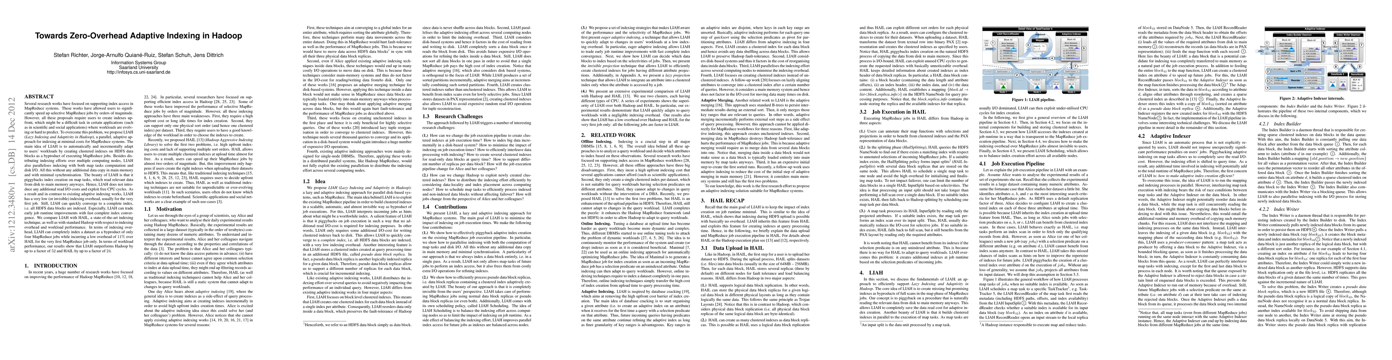 LIAH (Lazy Indexing and Adaptivity in Hadoop) proposes a parallel, adaptive indexing method for MapReduce systems that minimizes overhead by creating clustered indexes incrementally during MapReduce job execution, leveraging existing data reads and CPU cycles without additional data copying or synchronization. LIAH demonstrates low initial indexing overhead and can quickly converge to a complete index, outperforming existing adaptive indexing techniques in terms of performance and overhead.