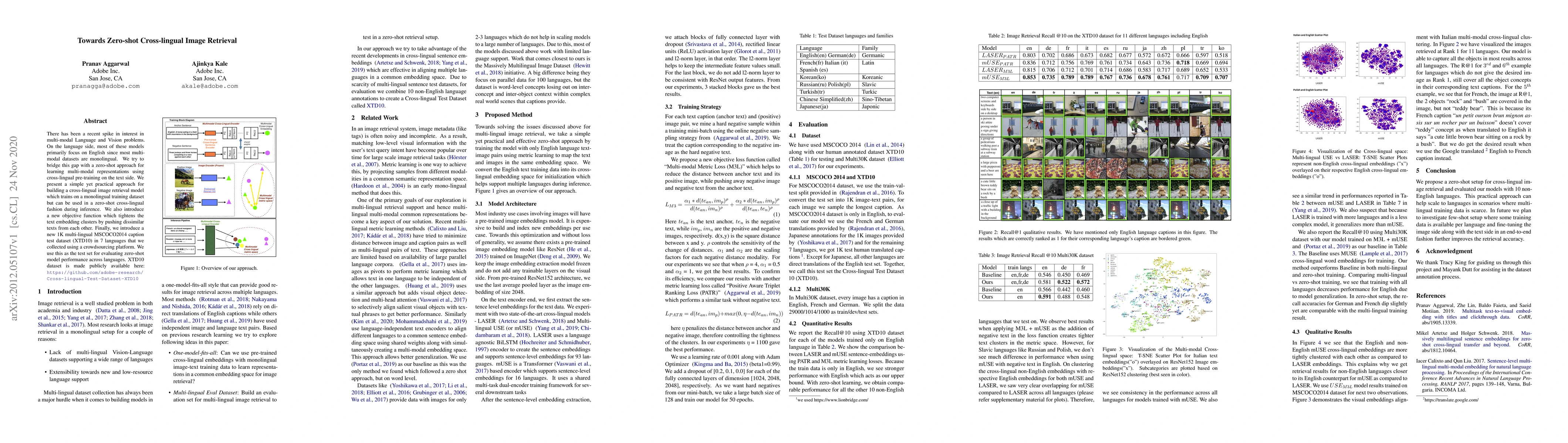There has been a recent spike in interest in multi-modal Language and Vision problems. On the language side, most of these models primarily focus on English since most multi-modal datasets are monolingual. We try to bridge this gap with a zero-shot approach for learning multi-modal representations using cross-lingual pre-training on the text side. We present a simple yet practical approach for building a cross-lingual image retrieval model which trains on a monolingual training dataset but can be used in a zero-shot cross-lingual fashion during inference. We also introduce a new objective function which tightens the text embedding clusters by pushing dissimilar texts from each other. Finally, we introduce a new 1K multi-lingual MSCOCO2014 caption test dataset (XTD10) in 7 languages that we collected using a crowdsourcing platform. We use this as the test set for evaluating zero-shot model performance across languages. XTD10 dataset is made publicly available here: https://github.com/adobe-research/Cross-lingual-Test-Dataset-XTD10