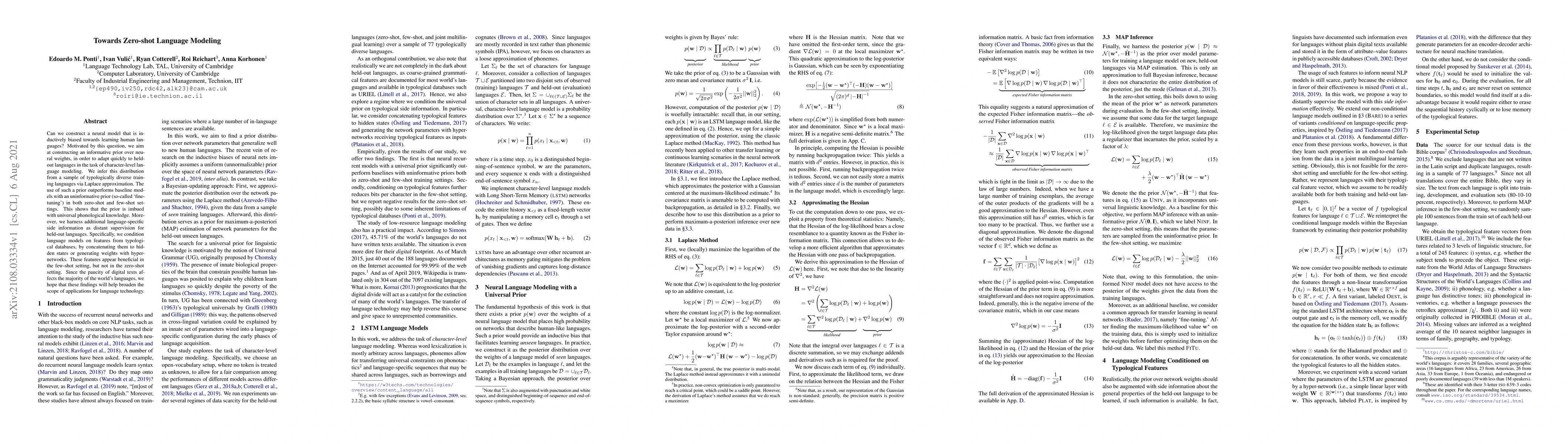 Can we construct a neural model that is inductively biased towards learning human languages? Motivated by this question, we aim at constructing an informative prior over neural weights, in order to adapt quickly to held-out languages in the task of character-level language modeling. We infer this distribution from a sample of typologically diverse training languages via Laplace approximation. The use of such a prior outperforms baseline models with an uninformative prior (so-called "fine-tuning") in both zero-shot and few-shot settings. This shows that the prior is imbued with universal phonological knowledge. Moreover, we harness additional language-specific side information as distant supervision for held-out languages. Specifically, we condition language models on features from typological databases, by concatenating them to hidden states or generating weights with hyper-networks. These features appear beneficial in the few-shot setting, but not in the zero-shot setting. Since the paucity of digital texts affects the majority of the world's languages, we hope that these findings will help broaden the scope of applications for language technology.