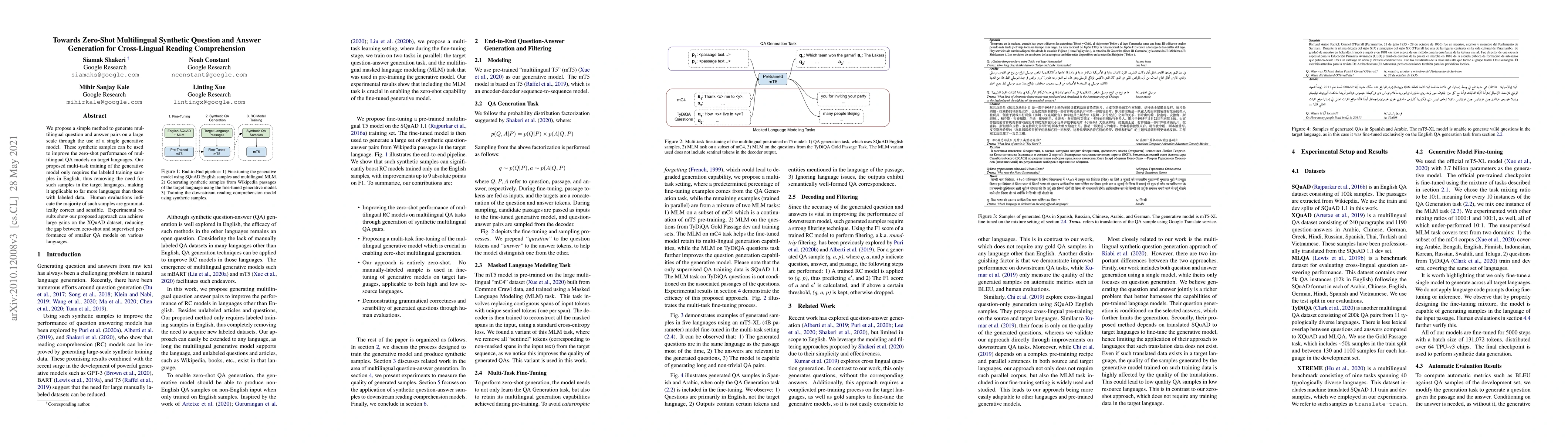 Researchers propose a method to generate synthetic multilingual question and answer pairs using a single generative model, improving zero-shot performance on target languages without requiring labeled data in those languages. The approach achieves large gains on the XQuAD dataset, reducing the gap between zero-shot and supervised performance for smaller QA models.
