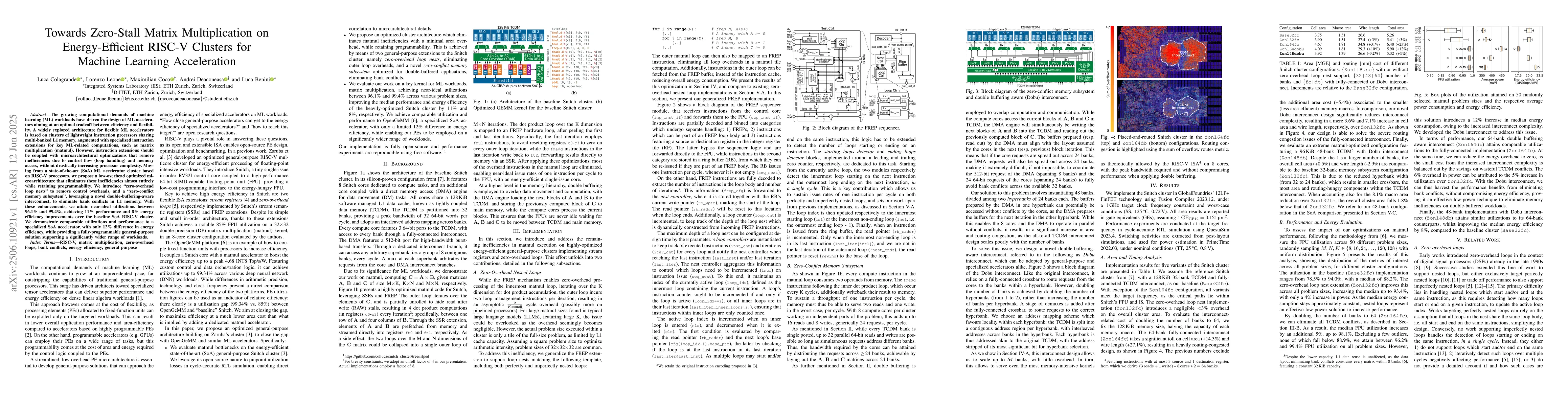 The growing computational demands of machine learning (ML) workloads have driven the design of ML accelerators aiming at an optimal tradeoff between efficiency and flexibility. A widely explored architecture for flexible ML accelerators is based on clusters of lightweight instruction processors sharing multi-banked L1 memory, augmented with specialized instruction extensions for key ML-related computations, such as matrix multiplication (matmul). However, instruction extensions should be coupled with microarchitectural optimizations that remove inefficiencies due to control flow (loop handling) and memory access, without drastically increasing processor complexity. Moving from a state-of-the-art (SoA) ML accelerator cluster based on RISC-V processors, we propose a low-overhead optimized microarchitecture that eliminates these inefficiencies almost entirely while retaining programmability. We introduce "zero-overhead loop nests" to remove control overheads, and a "zero-conflict memory subsystem", leveraging a novel double-buffering-aware interconnect, to eliminate bank conflicts in L1 memory. With these enhancements, we attain near-ideal utilizations between 96.1% and 99.4%, achieving 11% performance and 8% energy efficiency improvements over the baseline SoA RISC-V cluster. We demonstrate comparable utilizations and performance to a specialized SoA accelerator, with only 12% difference in energy efficiency, while providing a fully-programmable general-purpose solution supporting a significantly wider range of workloads.