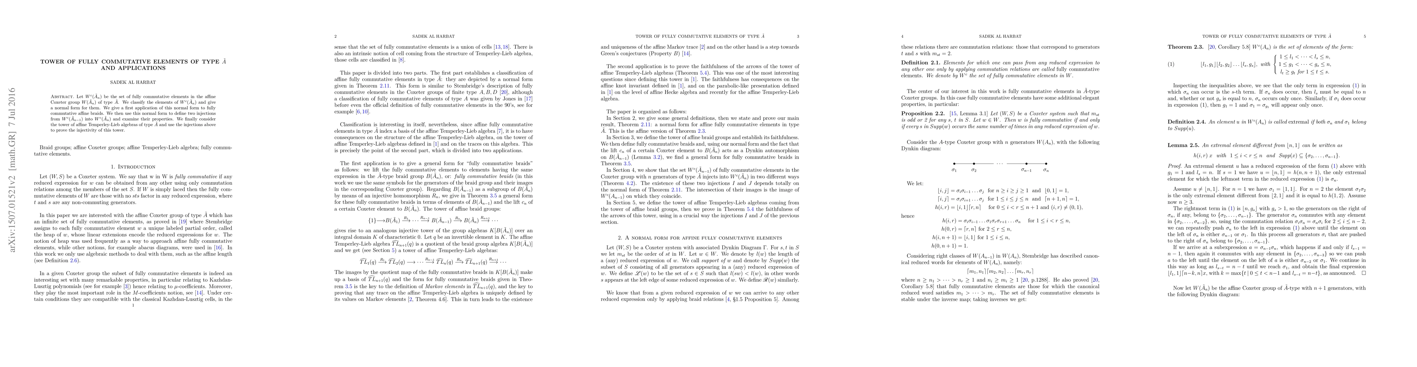 Let $W^c(\tilde A_{n})$ be the set of fully commutative elements in the affine Coxeter group $W(\tilde A_{n})$ of type $\tilde{A}$. We classify the elements of $W^c(\tilde A_{n})$ and give a normal form for its elements. We give a first application of this normal form to fully commutative affine braids. We then use this normal form to define two injections from $W^c(\tilde A_{n-1})$ into $W^c(\tilde A_{n})$ and examine their properties. We then consider the tower of affine Temperley-Lieb algebras of type $\tilde{A }$ and use the injections above to prove the injectivity of this tower.