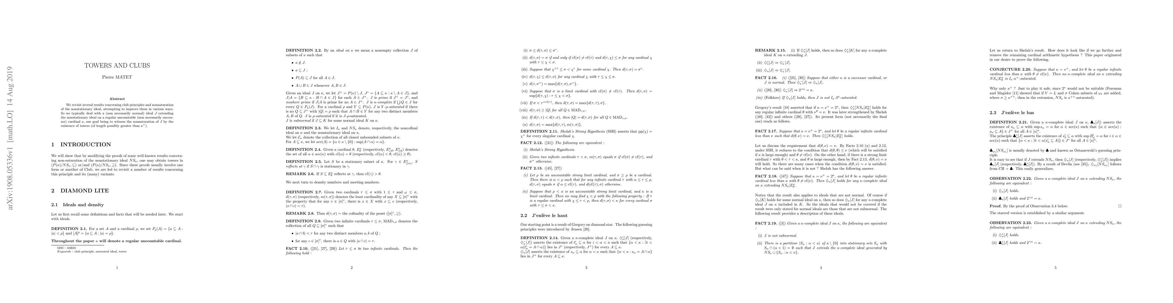 We revisit several results concerning club principles and nonsaturation of the nonstationary ideal, attempting to improve them in various ways. So we typically deal with a (non necessarily normal) ideal $J$ extending the nonstationary ideal on a regular uncountable (non necessarily successor) cardinal $\kappa$, our goal being to witness the nonsaturation of $J$ by the existence of towers (of length possibly greater than $\kappa^+$).