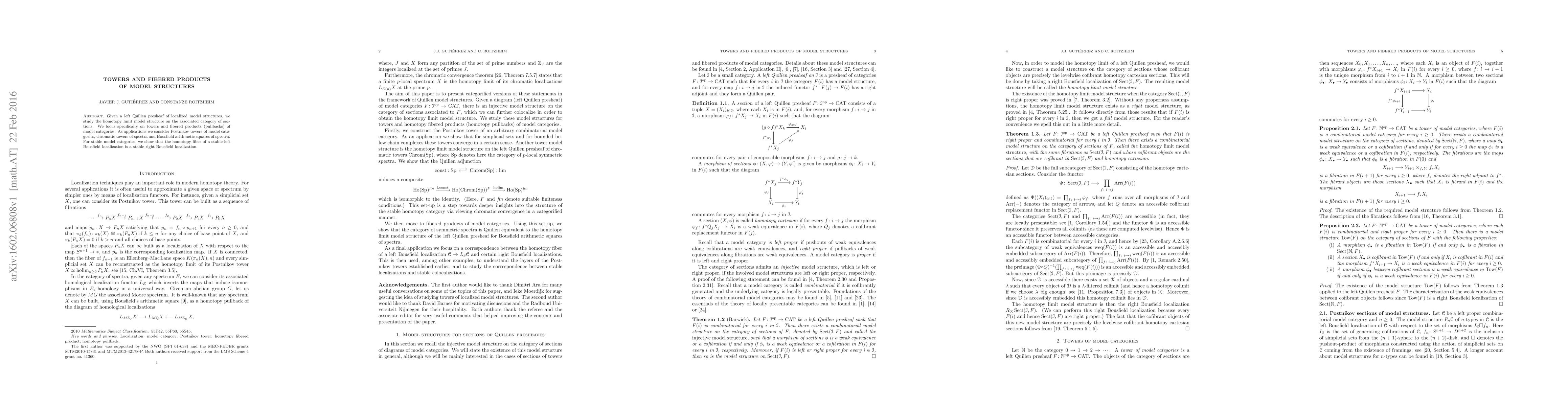 Given a left Quillen presheaf of localized model structures, we study the homotopy limit model structure on the associated category of sections. We focus specifically on towers and fibered products (pullbacks) of model categories. As applications we consider Postnikov towers of model categories, chromatic towers of spectra and Bousfield arithmetic squares of spectra. For stable model categories, we show that the homotopy fiber of a stable left Bousfield localization is a stable right Bousfield localization.