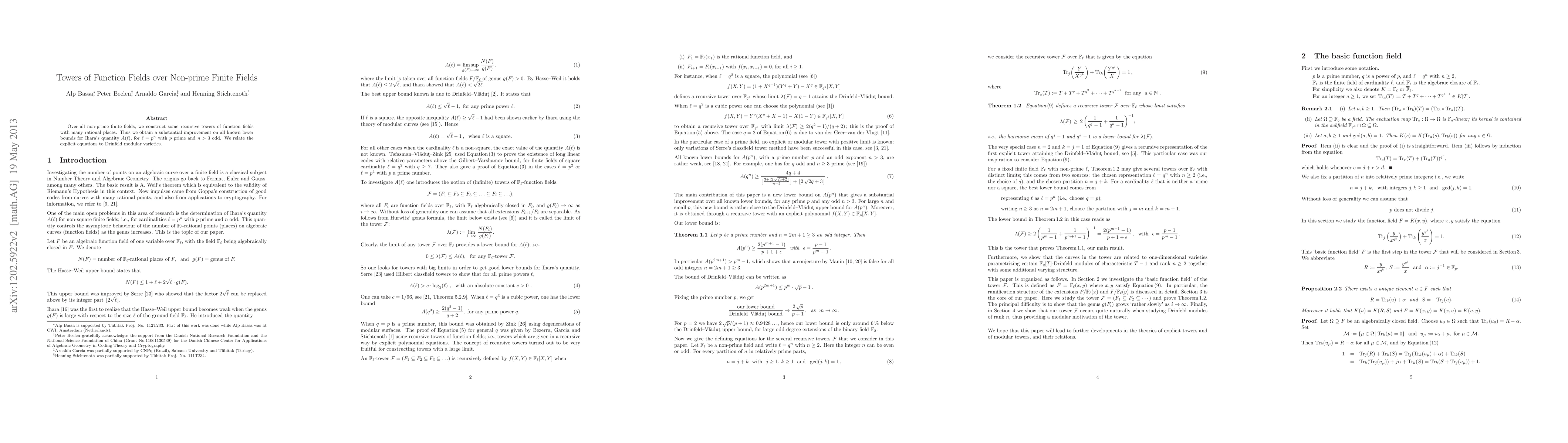 Over all non-prime finite fields, we construct some recursive towers of function fields with many rational places. Thus we obtain a substantial improvement on all known lower bounds for Ihara's quantity $A(\ell)$, for $\ell = p^n$ with $p$ prime and $n>3$ odd. We relate the explicit equations to Drinfeld modular varieties.