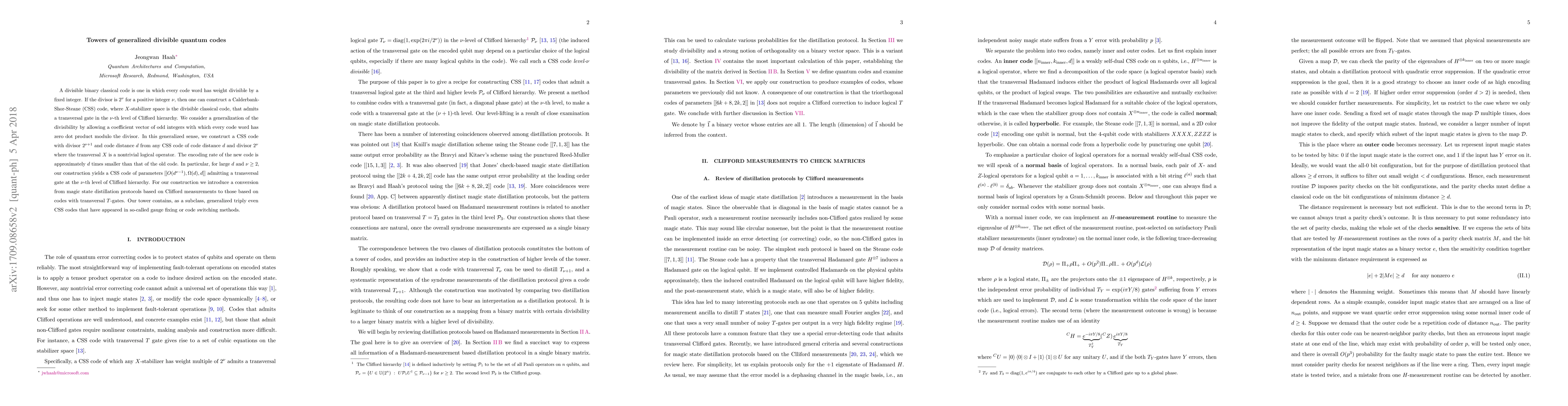 A divisible binary classical code is one in which every code word has weight divisible by a fixed integer. If the divisor is $2^\nu$ for a positive integer $\nu$, then one can construct a Calderbank-Shor-Steane (CSS) code, where $X$-stabilizer space is the divisible classical code, that admits a transversal gate in the $\nu$-th level of Clifford hierarchy. We consider a generalization of the divisibility by allowing a coefficient vector of odd integers with which every code word has zero dot product modulo the divisor. In this generalized sense, we construct a CSS code with divisor $2^{\nu+1}$ and code distance $d$ from any CSS code of code distance $d$ and divisor $2^\nu$ where the transversal $X$ is a nontrivial logical operator. The encoding rate of the new code is approximately $d$ times smaller than that of the old code. In particular, for large $d$ and $\nu \ge 2$, our construction yields a CSS code of parameters $[[O(d^{\nu-1}), \Omega(d),d]]$ admitting a transversal gate at the $\nu$-th level of Clifford hierarchy. For our construction we introduce a conversion from magic state distillation protocols based on Clifford measurements to those based on codes with transversal $T$-gates. Our tower contains, as a subclass, generalized triply even CSS codes that have appeared in so-called gauge fixing or code switching methods.