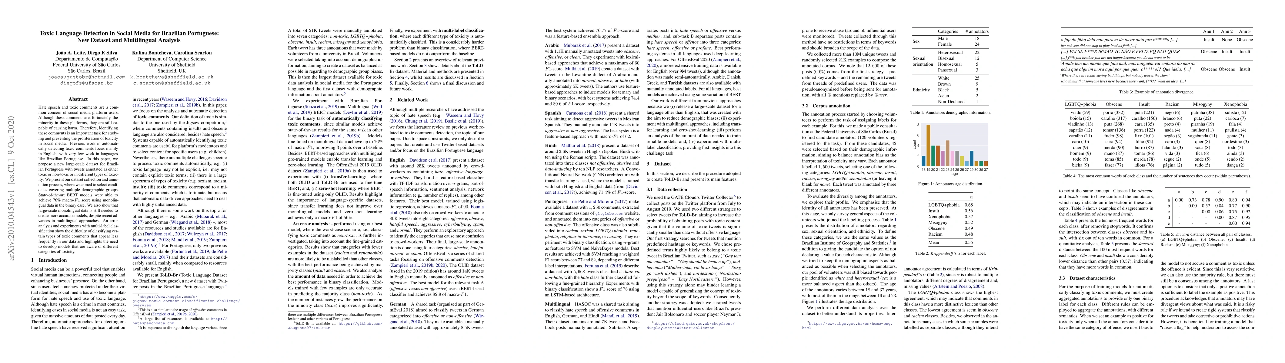 This paper introduces a new dataset for detecting toxic language in Brazilian Portuguese tweets, aiming to address the lack of resources in this language. Despite achieving a 76% macro-F1 score with BERT models, the study emphasizes the necessity for more data and highlights challenges in classifying less frequent toxic comments.