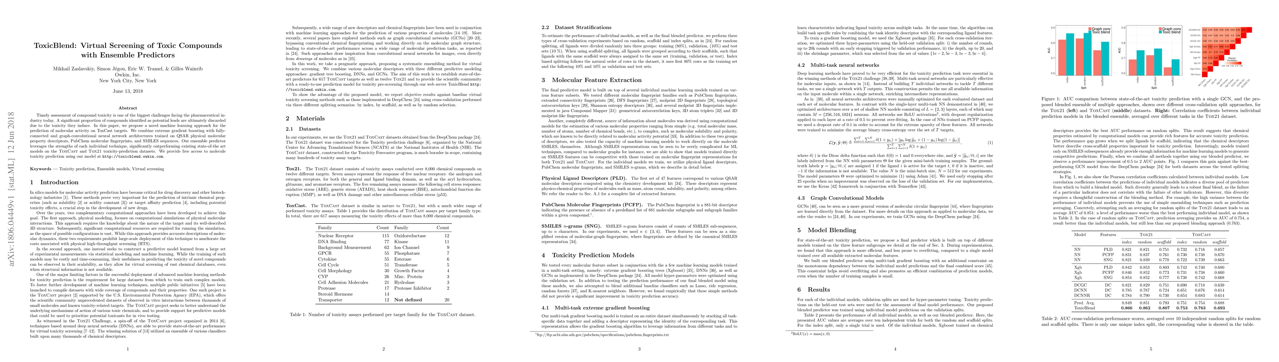 Timely assessment of compound toxicity is one of the biggest challenges facing the pharmaceutical industry today. A significant proportion of compounds identified as potential leads are ultimately discarded due to the toxicity they induce. In this paper, we propose a novel machine learning approach for the prediction of molecular activity on ToxCast targets. We combine extreme gradient boosting with fully-connected and graph-convolutional neural network architectures trained on QSAR physical molecular property descriptors, PubChem molecular fingerprints, and SMILES sequences. Our ensemble predictor leverages the strengths of each individual technique, significantly outperforming existing state-of-the art models on the ToxCast and Tox21 toxicity-prediction datasets. We provide free access to molecule toxicity prediction using our model at http://www.owkin.com/toxicblend.