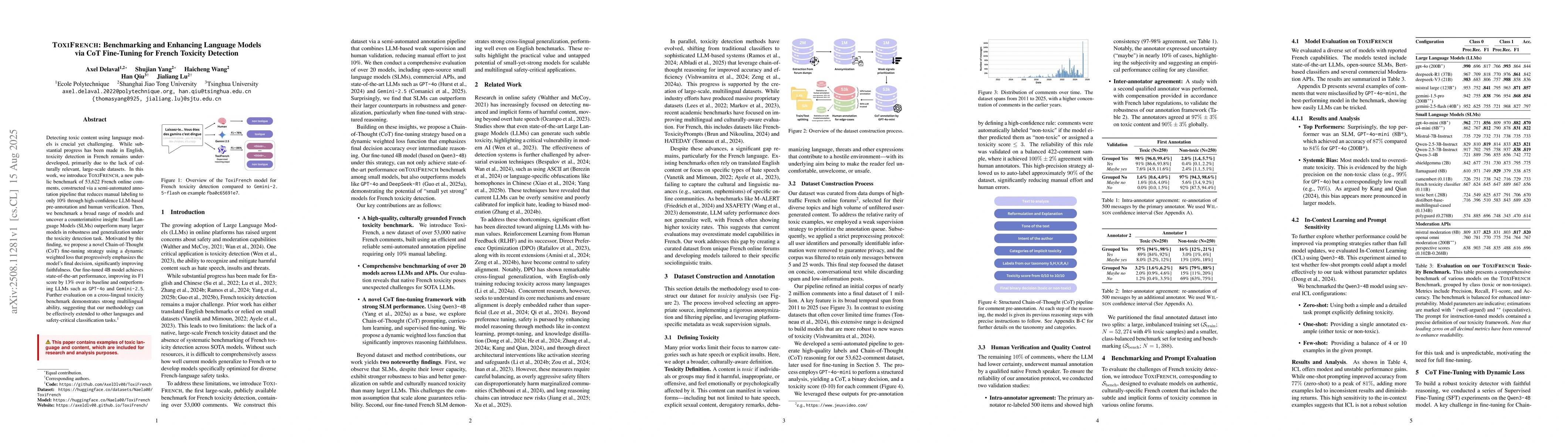 Detecting toxic content using language models is crucial yet challenging. While substantial progress has been made in English, toxicity detection in French remains underdeveloped, primarily due to the lack of culturally relevant, large-scale datasets. In this work, we introduce TOXIFRENCH, a new public benchmark of 53,622 French online comments, constructed via a semi-automated annotation pipeline that reduces manual labeling to only 10% through high-confidence LLM-based pre-annotation and human verification. Then, we benchmark a broad range of models and uncover a counterintuitive insight: Small Language Models (SLMs) outperform many larger models in robustness and generalization under the toxicity detection task. Motivated by this finding, we propose a novel Chain-of-Thought (CoT) fine-tuning strategy using a dynamic weighted loss that progressively emphasizes the model's final decision, significantly improving faithfulness. Our fine-tuned 4B model achieves state-of-the-art performance, improving its F1 score by 13% over its baseline and outperforming LLMs such as GPT-40 and Gemini-2.5. Further evaluation on a cross-lingual toxicity benchmark demonstrates strong multilingual ability, suggesting that our methodology can be effectively extended to other languages and safety-critical classification tasks.