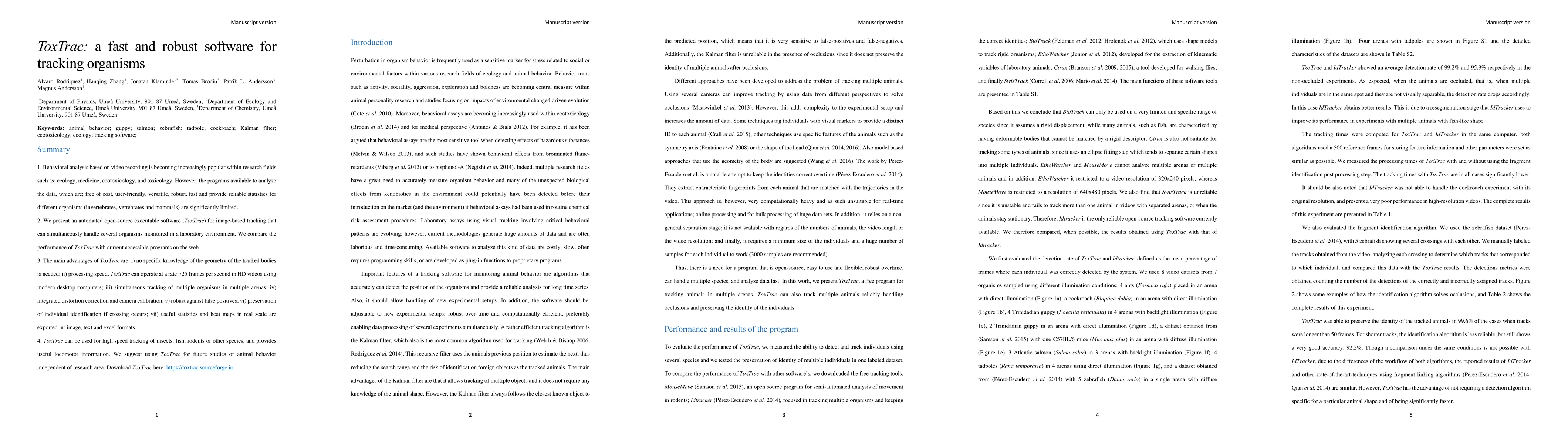 1. Behavioral analysis based on video recording is becoming increasingly popular within research fields such as; ecology, medicine, ecotoxicology, and toxicology. However, the programs available to analyze the data, which are; free of cost, user-friendly, versatile, robust, fast and provide reliable statistics for different organisms (invertebrates, vertebrates and mammals) are significantly limited. 2. We present an automated open-source executable software (ToxTrac) for image-based tracking that can simultaneously handle several organisms monitored in a laboratory environment. We compare the performance of ToxTrac with current accessible programs on the web. 3. The main advantages of ToxTrac are: i) no specific knowledge of the geometry of the tracked bodies is needed; ii) processing speed, ToxTrac can operate at a rate >25 frames per second in HD videos using modern desktop computers; iii) simultaneous tracking of multiple organisms in multiple arenas; iv) integrated distortion correction and camera calibration; v) robust against false positives; vi) preservation of individual identification if crossing occurs; vii) useful statistics and heat maps in real scale are exported in: image, text and excel formats. 4. ToxTrac can be used for high speed tracking of insects, fish, rodents or other species, and provides useful locomotor information. We suggest using ToxTrac for future studies of animal behavior independent of research area. Download ToxTrac here: https://toxtrac.sourceforge.io