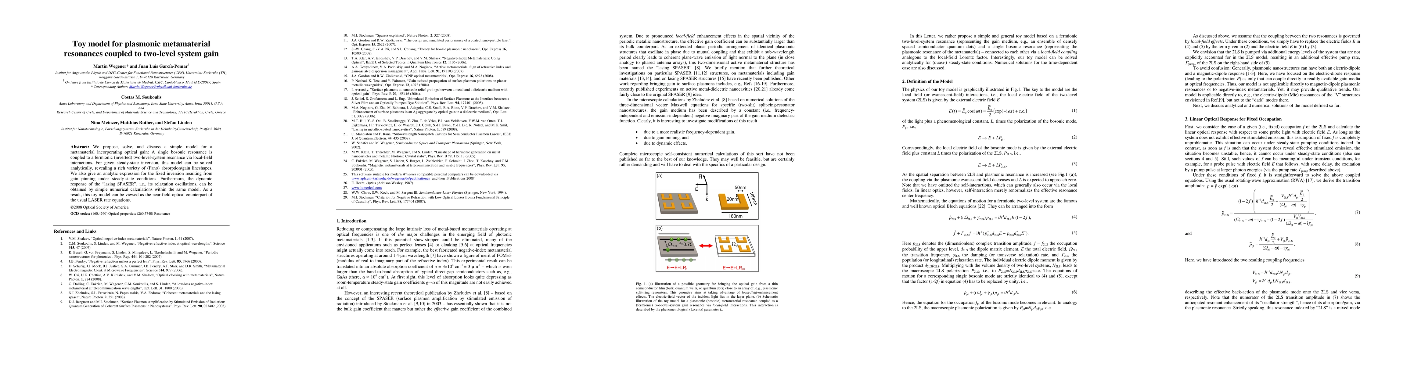 We propose, solve, and discuss a simple model for a metamaterial incorporating optical gain: A single bosonic resonance is coupled to a fermionic (inverted) two-level-system resonance via local-field interactions. For given steady-state inversion, this model can be solved analytically, revealing a rich variety of (Fano) absorption/gain lineshapes. We also give an analytic expression for the fixed inversion resulting from gain pinning under steady-state conditions. Furthermore, the dynamic response of the 'lasing SPASER', i.e., its relaxation oscillations, can be obtained by simple numerical calculations within the same model. As a result, this toy model can be viewed as the near-field-optical counterpart of the usual LASER rate equations.