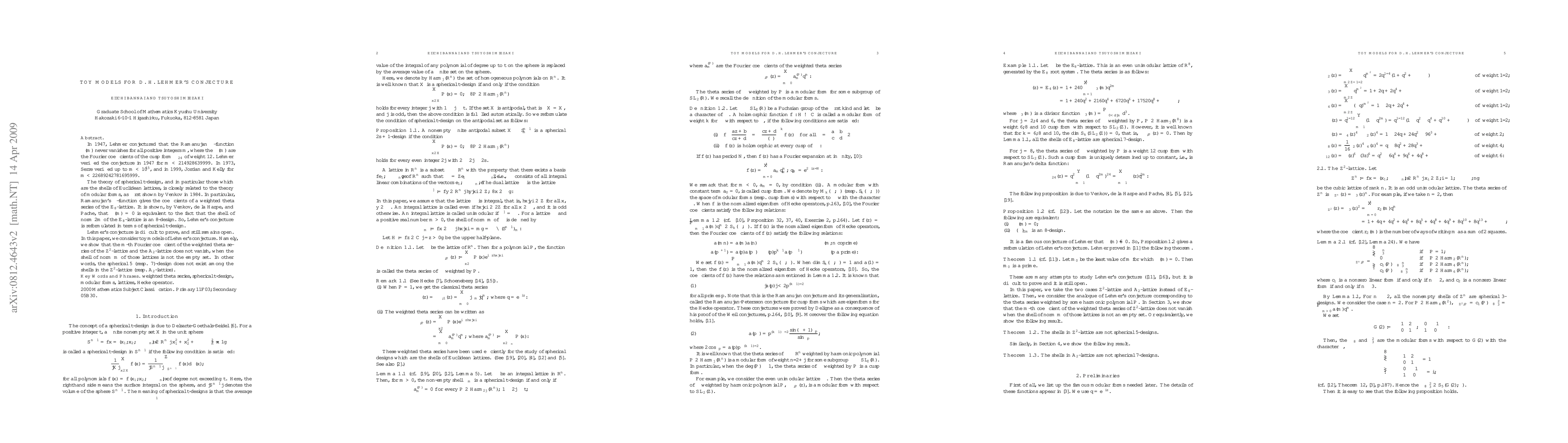 This paper explores toy models for D. H. Lehmer's conjecture, which posits that the Ramanujan $\tau$-function never vanishes for all positive integers. The authors demonstrate that the $m$-th Fourier coefficient of the weighted theta series of the $\mathbb{Z}^2$-lattice and $A_{2}$-lattice does not vanish when the corresponding lattice shells are non-empty, implying the non-existence of spherical 5- and 7-designs in these lattices.