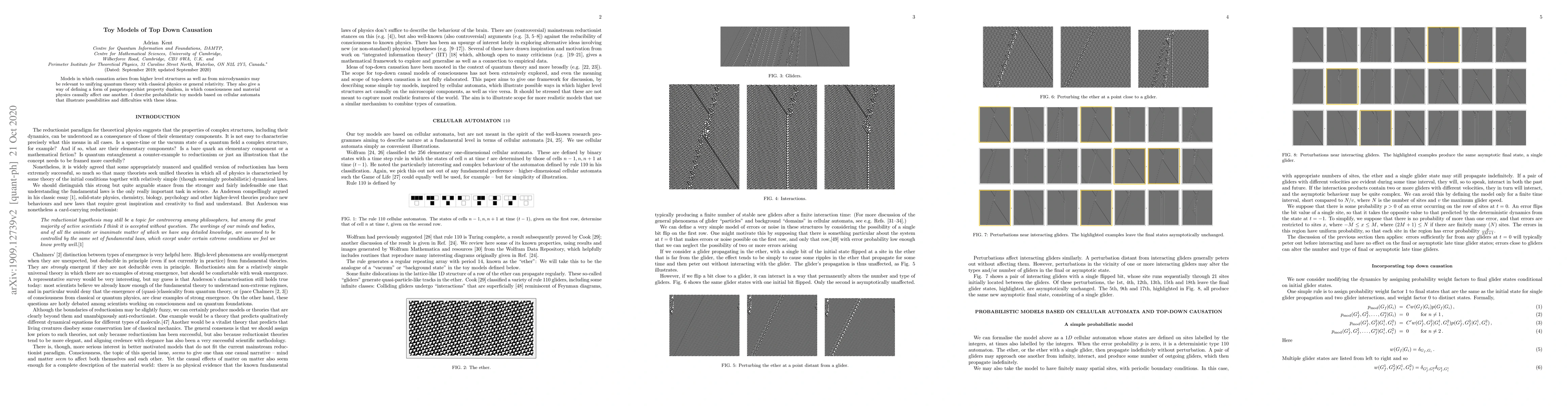 Models in which causation arises from higher level structures as well as from microdynamics may be relevant to unifying quantum theory with classical physics or general relativity. They also give a way of defining a form of panprotopsychist property dualism, in which consciousness and material physics causally affect one another. I describe toy models based on probabilistic cellular automata that illustrate possibilities and difficulties with these ideas.