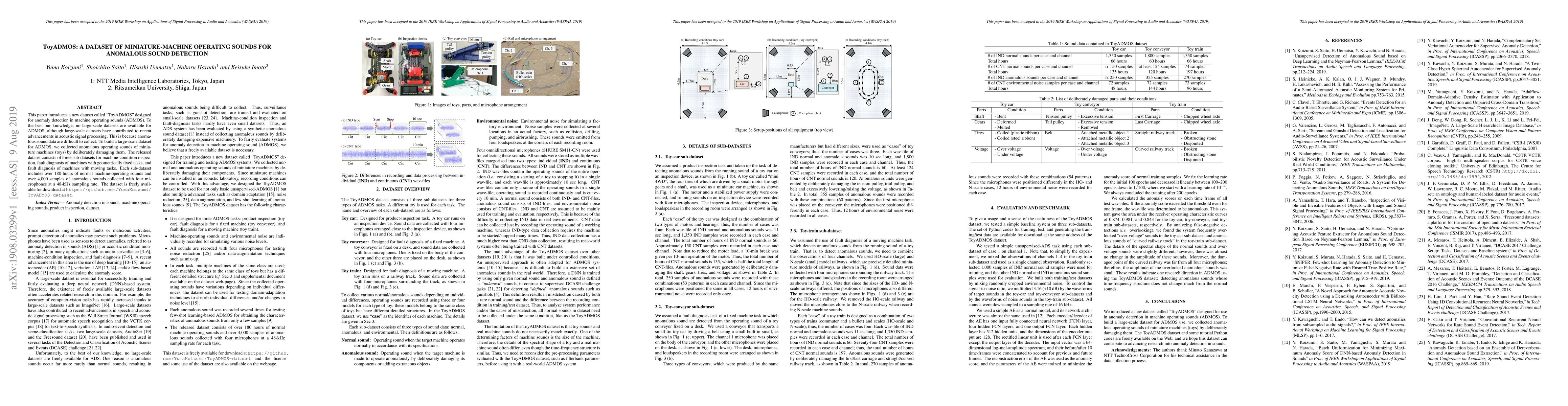 This paper presents "ToyADMOS," a new dataset for detecting anomalies in machine operating sounds, comprising over 180 hours of normal and 4,000 anomalous sounds from miniature machines. The dataset is freely available for advancing acoustic signal processing research.
