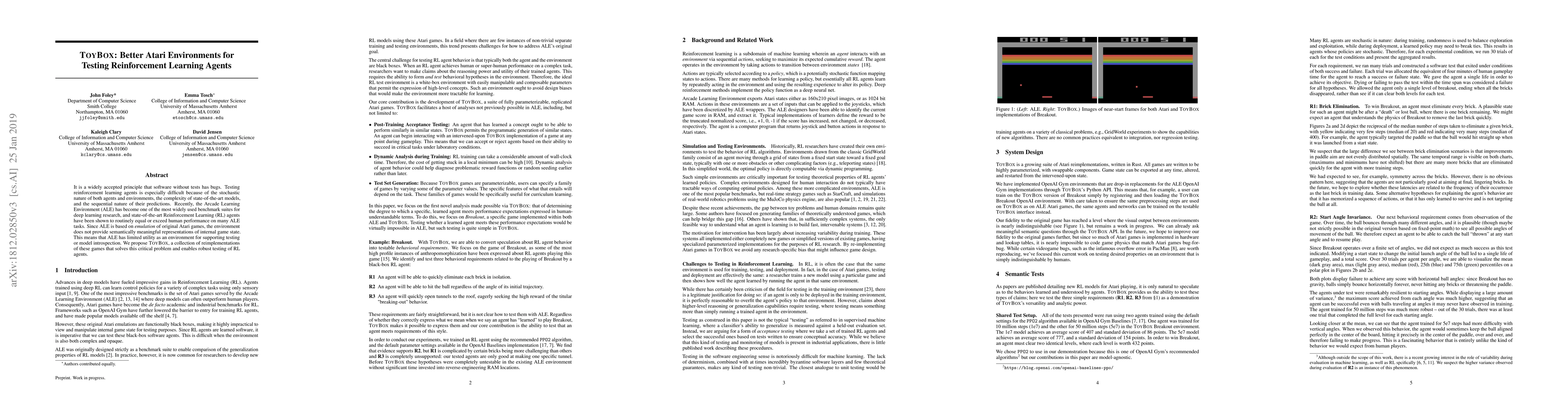 It is a widely accepted principle that software without tests has bugs. Testing reinforcement learning agents is especially difficult because of the stochastic nature of both agents and environments, the complexity of state-of-the-art models, and the sequential nature of their predictions. Recently, the Arcade Learning Environment (ALE) has become one of the most widely used benchmark suites for deep learning research, and state-of-the-art Reinforcement Learning (RL) agents have been shown to routinely equal or exceed human performance on many ALE tasks. Since ALE is based on emulation of original Atari games, the environment does not provide semantically meaningful representations of internal game state. This means that ALE has limited utility as an environment for supporting testing or model introspection. We propose ToyBox, a collection of reimplementations of these games that solves this critical problem and enables robust testing of RL agents.