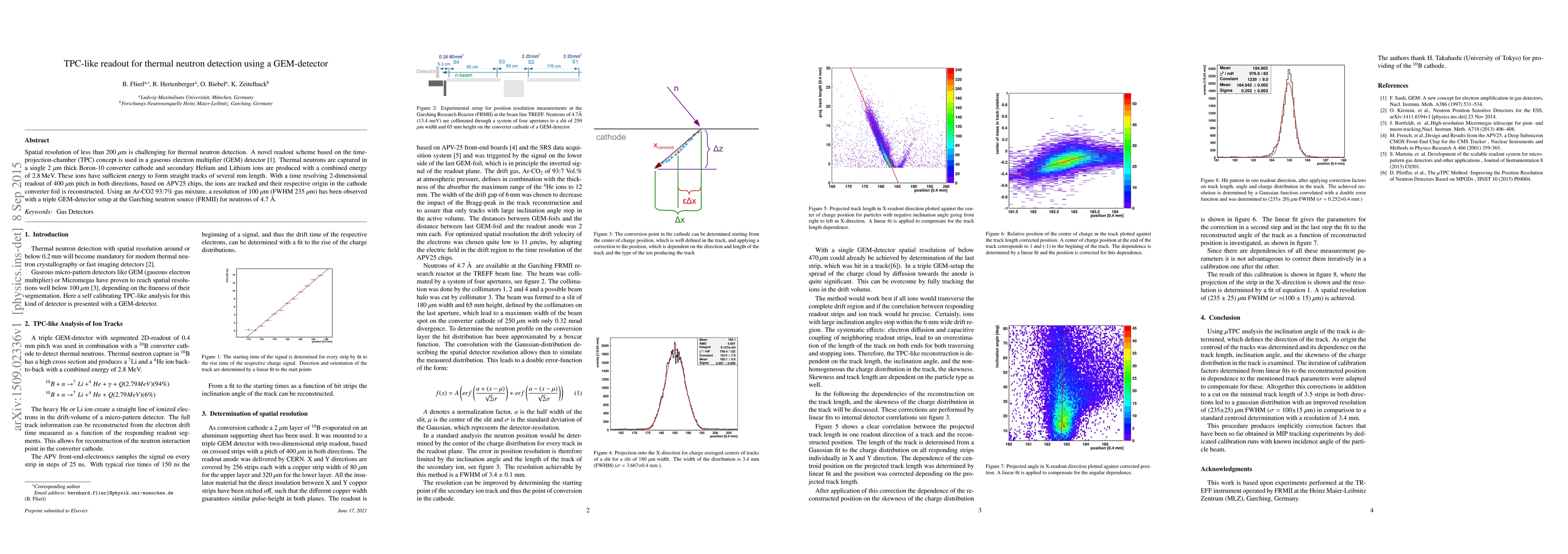 Spatial resolution of less than 200 um is challenging for thermal neutron detection. A novel readout scheme based on the time-projection-chamber (TPC) concept is used in a gaseous electron multiplier (GEM) detector. Thermal neutrons are captured in a single 2 um thick Boron-10 converter cathode and secondary Helium and Lithium ions are produced with a combined energy of 2.8 MeV. These ions have sufficient energy to form straight tracks of several mm length. With a time resolving 2-dimensional readout of 400 um pitch in both directions, based on APV25 chips, the ions are tracked and their respective origin in the cathode converter foil is reconstructed. Using an Ar-CO2 93:7% gas mixture, a resolution of 100 um (FWHM 235 um) has been observed with a triple GEM-detector setup at the Garching neutron source (FRMII) for neutrons of 4.7 Angstrom.